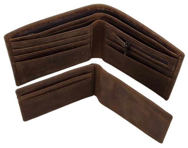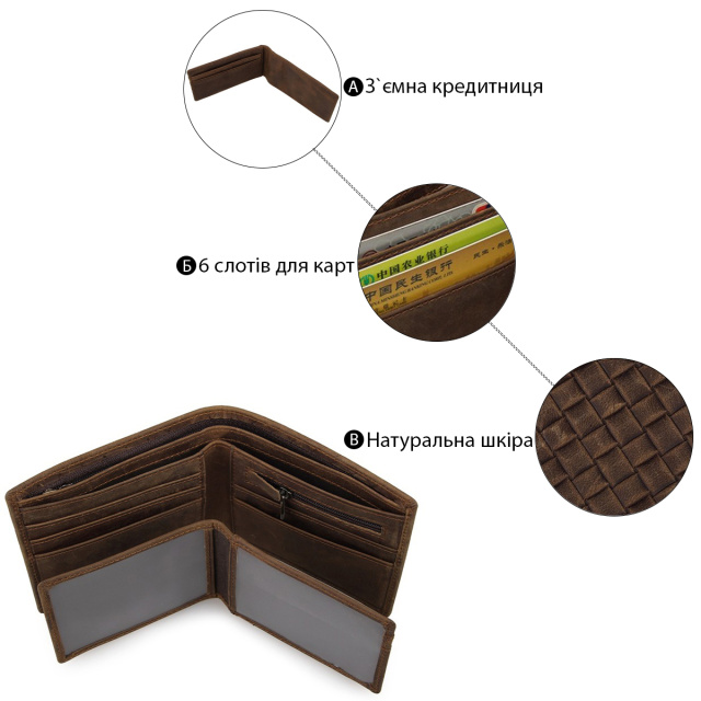 Отличный мужской бумажник из натуральной высококачественной натуральной кожи. Внешняя сторона аксессуара украшена тесненным декоративным рисунком. Цвет фурнитуры: латунь. Кошелек аккуратно прошит светло-коричневой нитью. Бумажник упакован в текстильный пылезащитный чехол белого цвета.