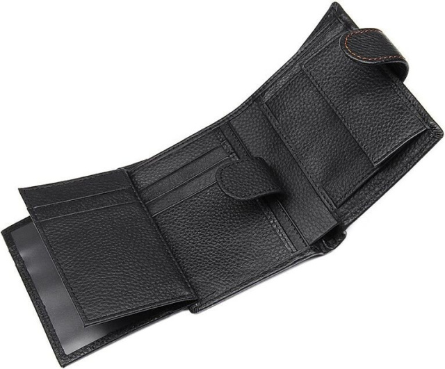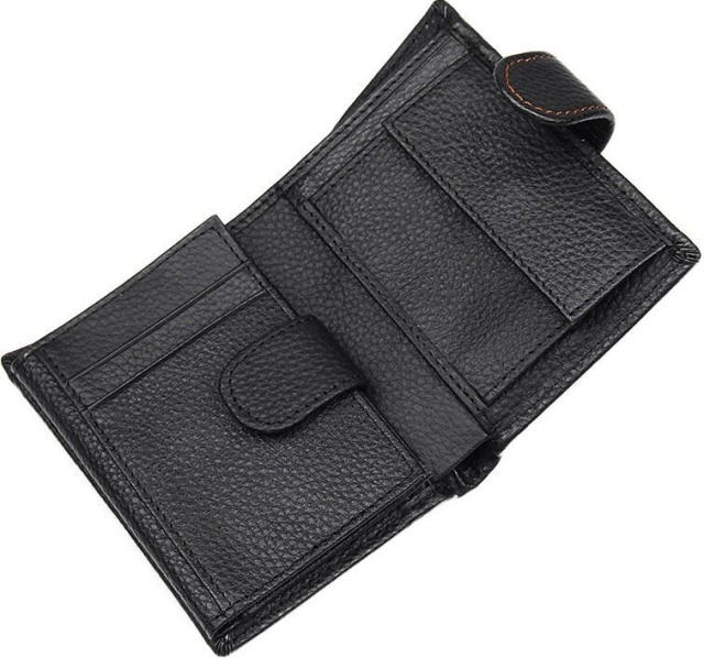 Вертикальный мужской кошелек черного цвета. Аксессуар выполнен из натуральной высококачественной фактурной кожи приятной на ощупь. Бумажник аккуратной прошит светло-коричневой нитью, что придает ему изюминку. Цвет фурнитуры: латунь. Изделие упаковано в текстильный пылезащитный мешочек белого цвета.