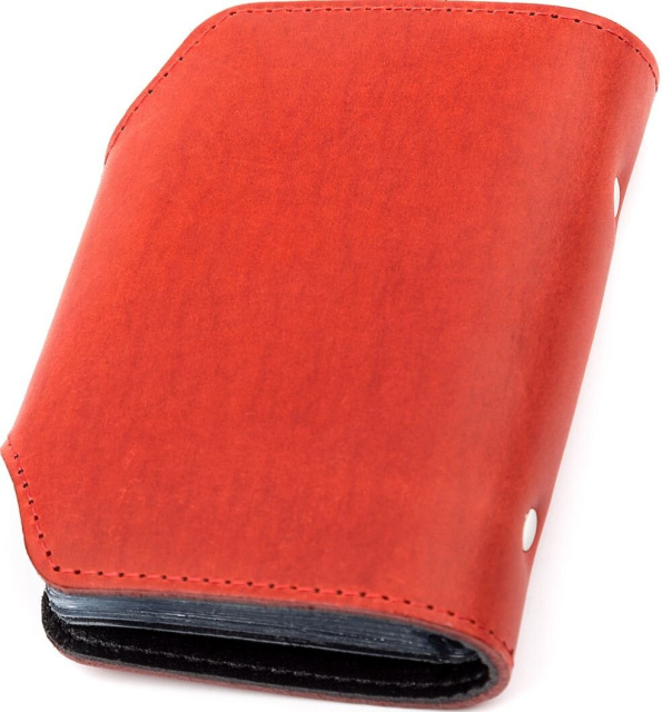 Яркая визитница из натуральной винтажной кожи особенностью, которой есть потертости и неоднородность окраса. Со временем кожа затирается и шлифуется, так что некоторые следы исчезнут сами собой. Аксессуар прошит прочной светло-красной нитью, что отлично вписывается в дизайн и продлевает срок службы изделия.