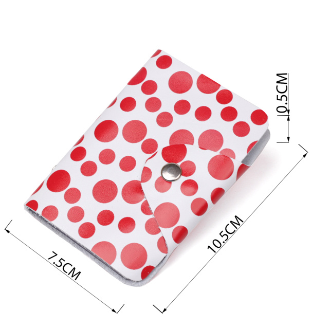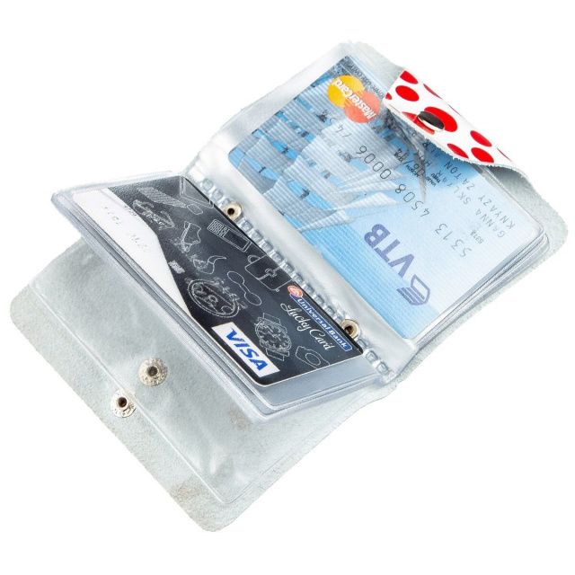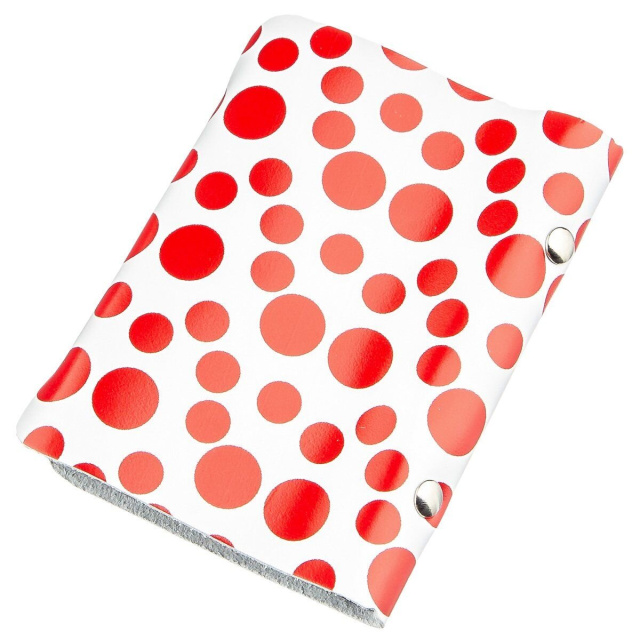 Визитница с оригинальным принтом в красный горошек и натуральной кожи высокого качества. Аксессуар просто необходим для тех, кто носит с собой много карточек и хочет их содержать в полном порядке. Визиница закрывается на хлястик с кнопкой и станет нужным аксессуаром для любого человека.