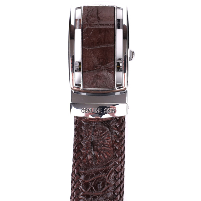 Фантастический ремень из натуральной кожи крокодила. Аксессуар изготовлен на основании из гладкой телячьей кожи, в качестве дополнительной отделки по внешнему краю аксессуара сделана оплетка из гладкой кожи под цвет ремня. Изделие оборудовано съемной автоматической пряжкой, которая декорированная вставкой, из натуральной кожи крокодила. Изделия из кожи крокодила всегда считались большой роскошью, так как в мире не так уж много компаний, которые занимаются выделкой такой кожи, поскольку этот процесс действительно чрезвычайно трудоемкий. Идеальный подарок для людей, которые любят все дорогое и качественное. Ремень универсальный, его можно носить как под джинсы, так и под брюки. Каждое полотно имеет уникальный, не повторяющийся узор, поэтому, покупая ремень из кожи крокодила, вы можете быть полностью уверенны в том, что второго такого ремня нет в природе.