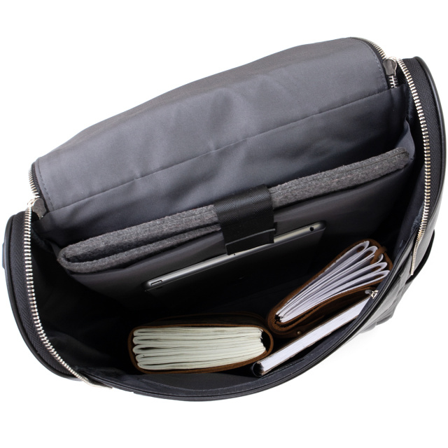Модель имеет одно вместительное основное отделение, в котором удобно размещать ноутбук, документы, книги, рабочие вещи и все необходимое в течение дня. На задней стенке внутри предусмотрены два накладных кармана и одно отделение на липучке, что позволяет удобно организовать мелкие вещи. На передней стенке расположено накладное отделение на магните для быстрого доступа к предметам, которые должны быть под рукой.