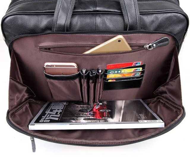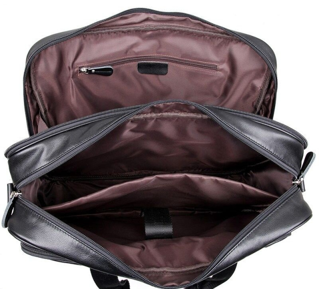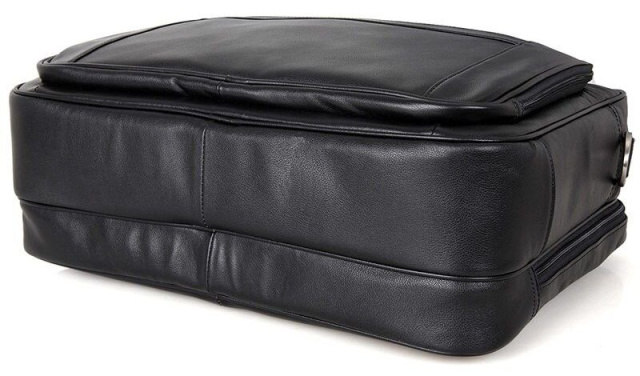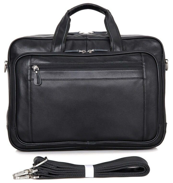 Элитная мужская сумка для ноутбука до 17-ти дюймов. Аксессуар выполнен из натуральной высококачественной кожи черного цвета. Цвет фурнитуры: серебро. Переносить данную модель можно в руке, или через плечо (в комплекте съемный, регулируемый плечевой ремень). На лицевой стороне расположен потайной карман на молнии, а также огромное отделение на молнии в котором Вы найдете: