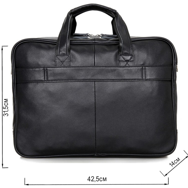 Цвет: черный; Материал: натуральная кожа высокого качества; Размеры: 42.5 на 31.5 на 14 см. Элитная мужская сумка для ноутбука до 17-ти дюймов.