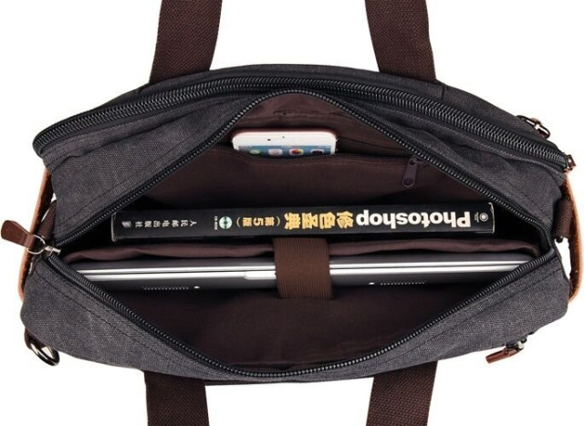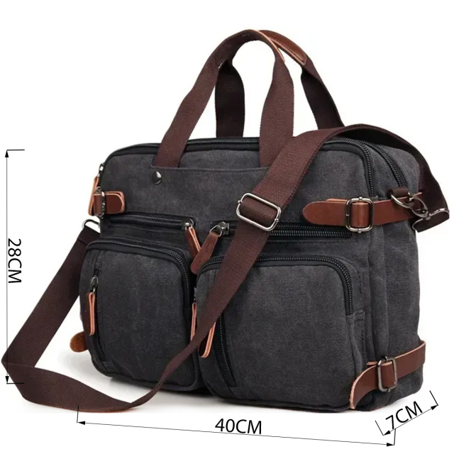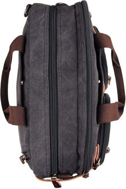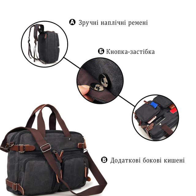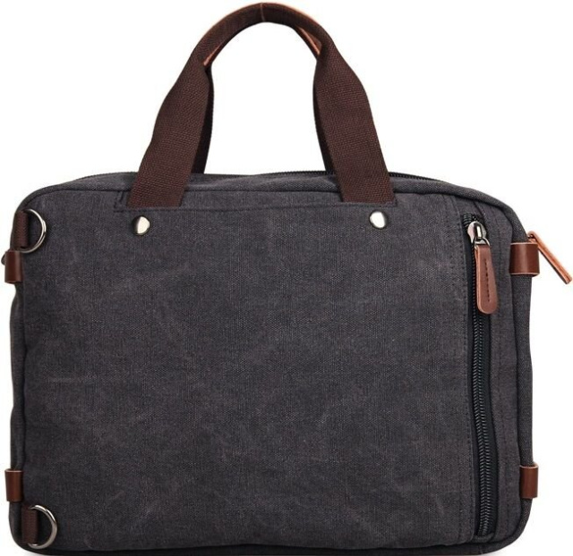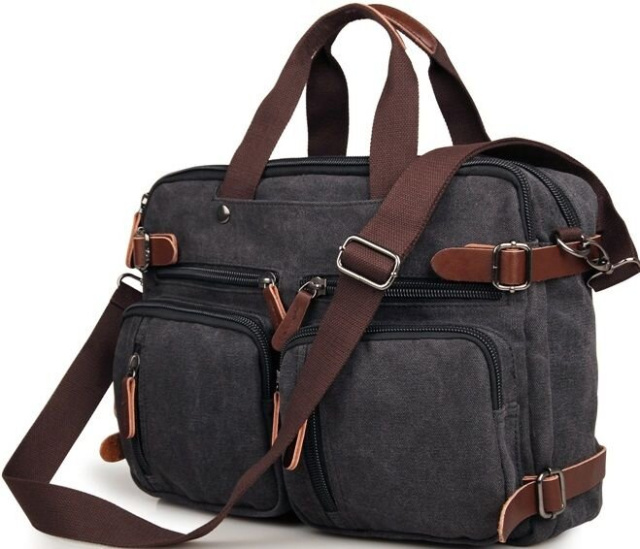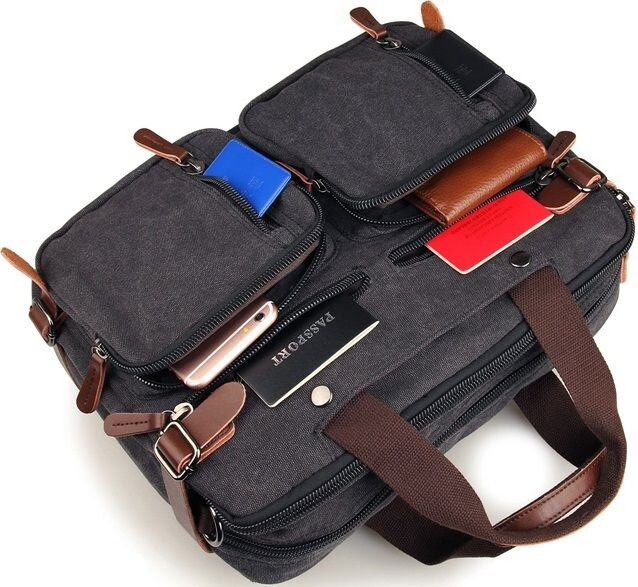 Вместительная мужская сумка-трансформер из прочной ткани. Изделие состоит из двух больших отделений, которые закрываются на надежные толстые молнии. В первом отделении находится отделение с мягкой перегородкой для 15-дюймового ноутбука, а также потайной карманчик на змейке. Во втором отделении два небольших кармана под кошелек и телефон.