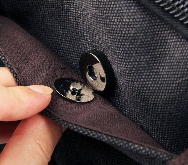 На тыльной стороне прорезной карман на молнии (куда прячутся ремни с рюкзака). Маленькие ручки для носки в руках также прячутся в прорезные карманы с обеих сторон и закрываются на магниты.