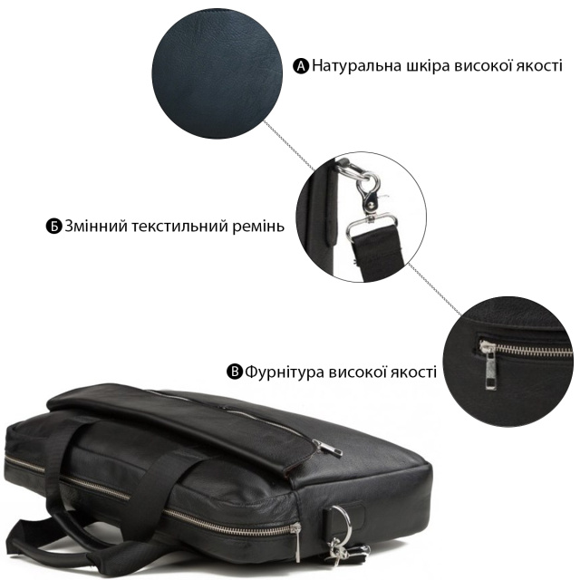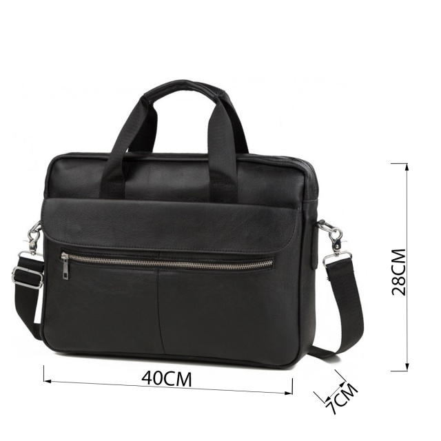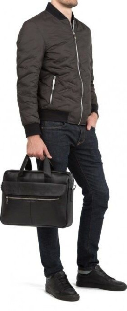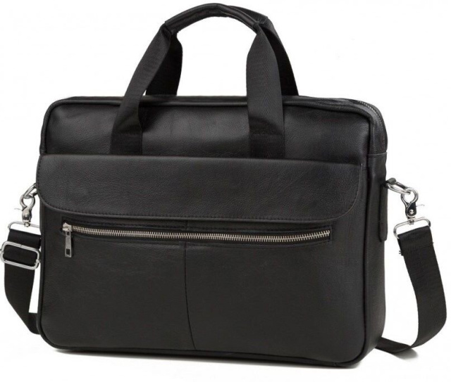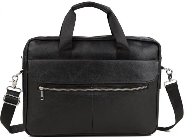 Многофункциональная мужская сумка с отделением для небольшого ноутбука 15”, а также документов формата А4. Аксессуар выполнен из натуральной зернистой кожи черного цвета. На лицевой стороне данного изделия расположены два вместительных отделения, одно под клапаном на магнитах и другое на молнии. На задней внешней стороне находится еще одно отделение на молнии. Сумку можно переносить в руке при помощи удобных кожано-текстильных ручек, а также через плечо (в комплекте съемный, регулируемый плечевой ремень, который выполнен из текстильного материала). Цвет фурнитуры: серебро.
