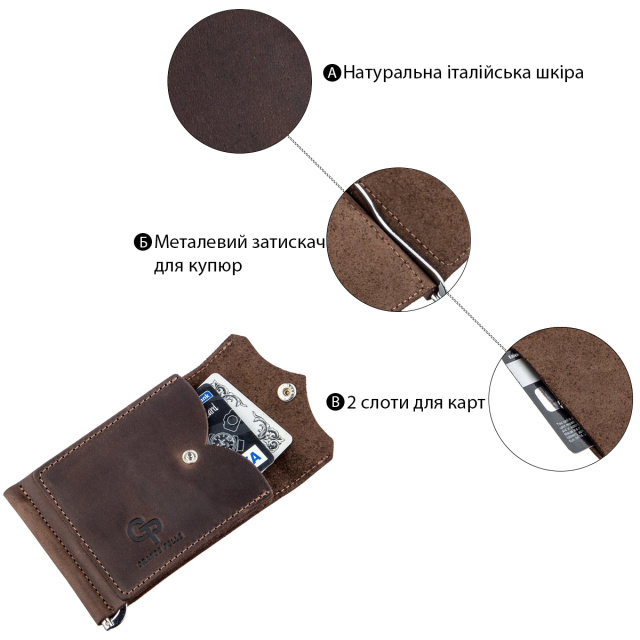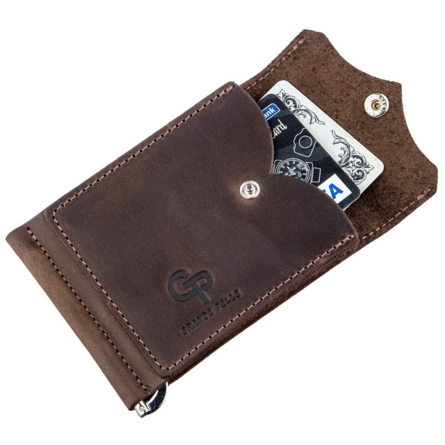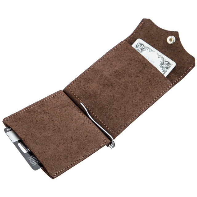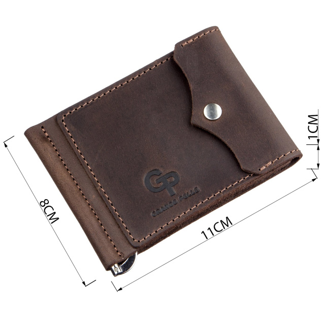 Компактный зажим из итальянской натуральной кожи высочайшего качества коричневого цвета. На лицевой стороне аксессуара тисненый логотип бренда-производителя. Зажим станет для вас идеальным решением, если вы не являетесь поклонником портмоне или клатчей. За счет своего небольшого размера зажим легко поместится в карман или небольшую сумку. Вы также можете положить в него пару необходимых кредиток Сама конструкция зажима изготовлена из надежного металла. Изделие станет прекрасным подарком для близкого человека. Модель упакована в войлочный чехол.
