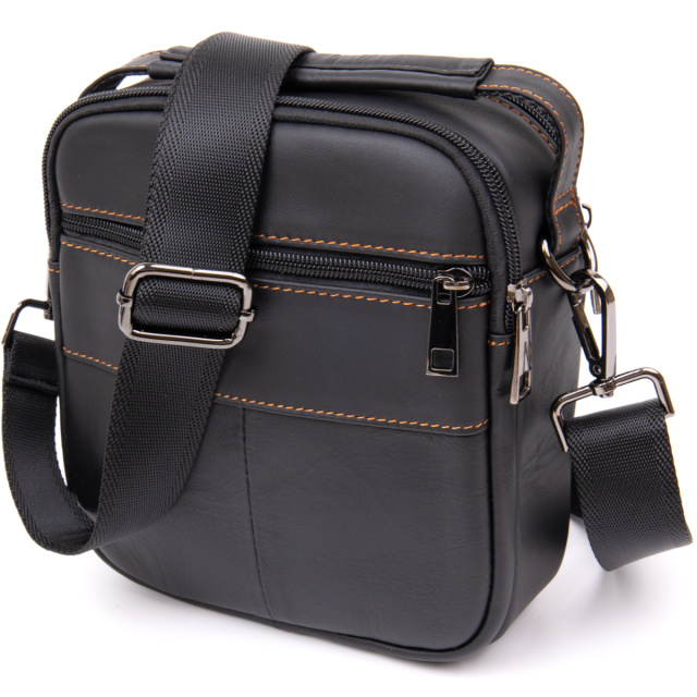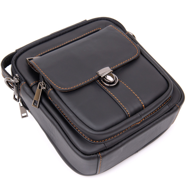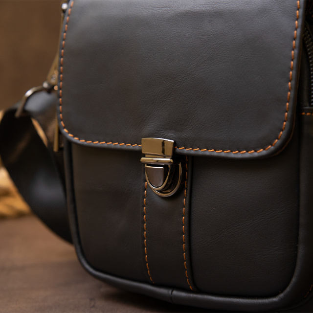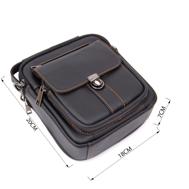 Компактная сумка в плотной коже гладкого типа. Изделие имеет в дизайне рыжую строчку. Изделие имеет очень практичный функционал несмотря на свой компактный размер. В сумку можно поместить ваши личные вещи (мобильный, кошелек, документы, кредитницу, повербанк, ключи и многое другое). Изделие дополнено качественной фурнитурой. Производство - фабричный Китай высокого качества. В комплекте к сумке - пылезащитный чехол. Сумка - идеальный вариант как для себя так и на подарок.