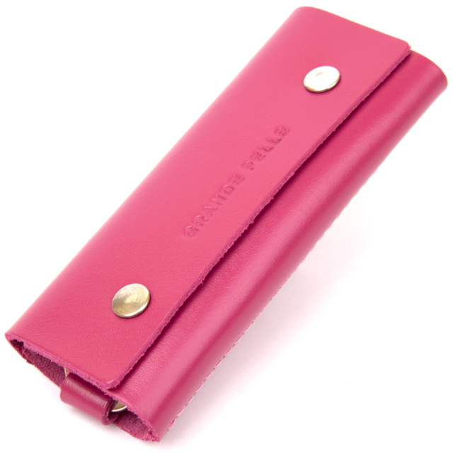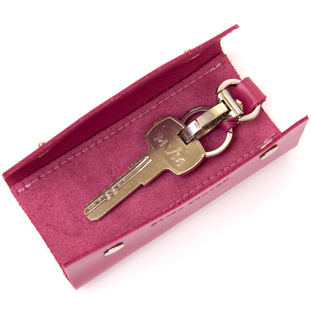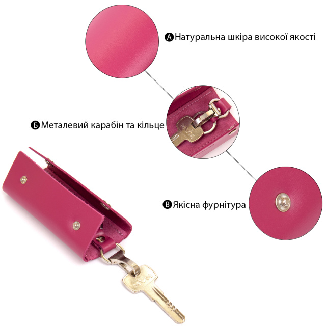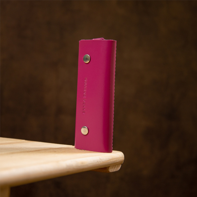Материал: натуральная кожа; Размеры (ШхВ, см): 11,3х4,5х2; Цвет: фуксия; Страна производитель: Украина. Оригинальная ключница от украинского бренда на кнопках в ярком и незабываемом цвете. Модель из натуральной кожи. На лицевой стороне аксессуара тиснение в виде логотипа бренда. Внутри ключницы кольцо и карабин для ключей. Аксессуар очень компактный и с легкостью поместится в карман или маленькую сумочку. С такой кожаной ключницей ваши карманы будут целыми, а ключи в одном надежном месте. Рекомендуем данную модель в качестве подарка себе или своим близким и друзьям.