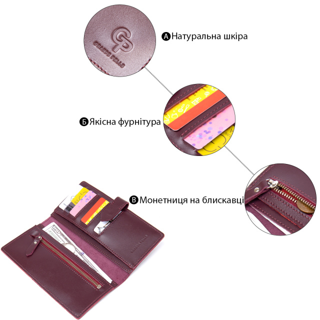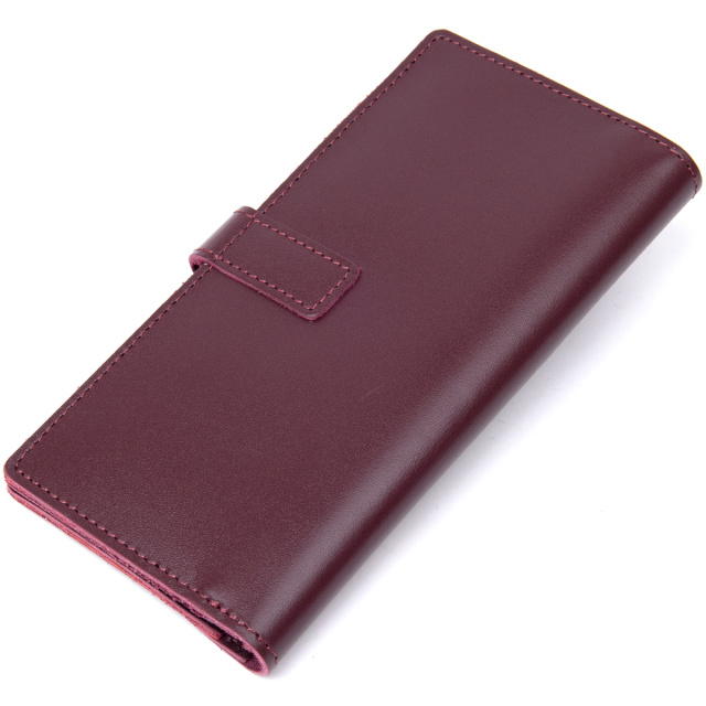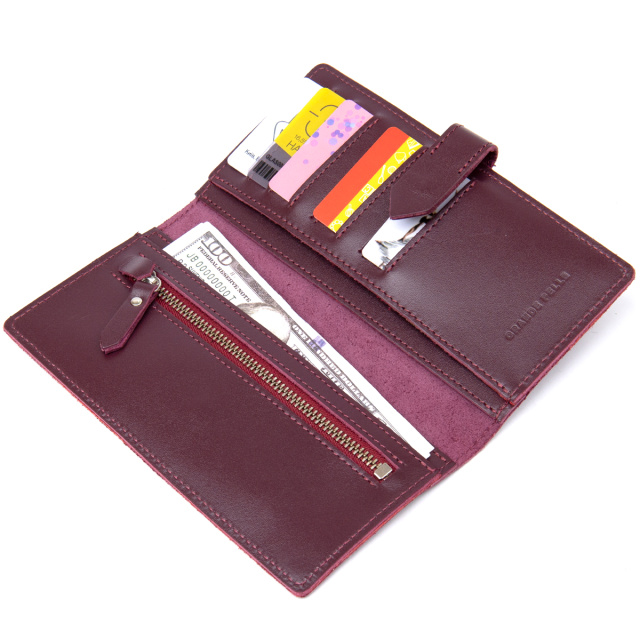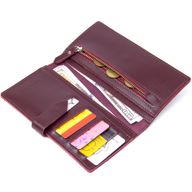 Красивое и многофункциональное портмоне из высококлассной натуральной кожи. Закрывается на хлястик с металлической кнопкой. Наполнение представлено в виде практичных отделений для купюр, монет и слотов для кредитных и визитных карточек. Упаковка кошелька представлена в виде фирменной картонной белой коробки.
