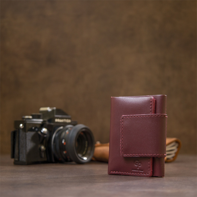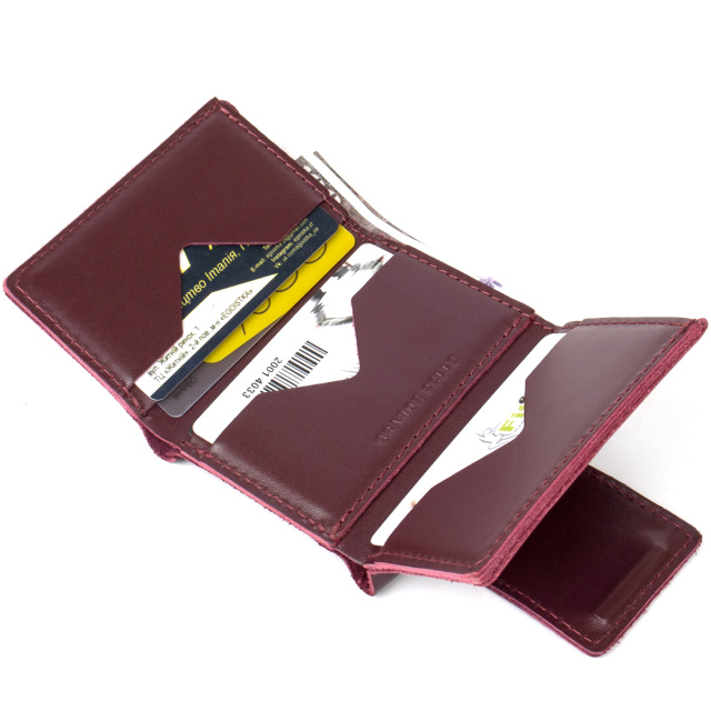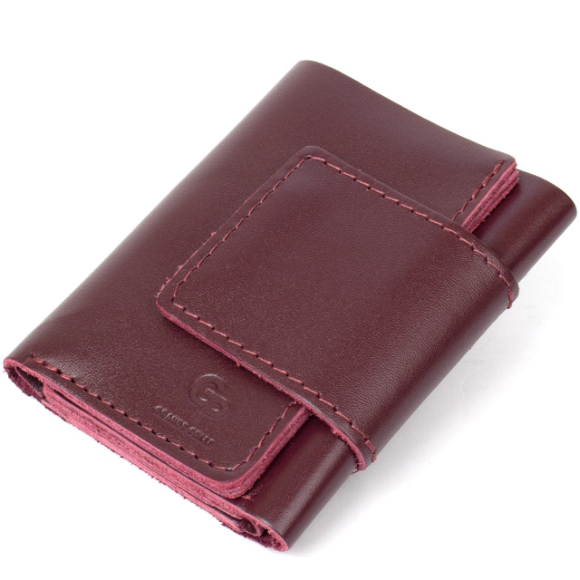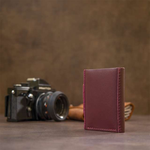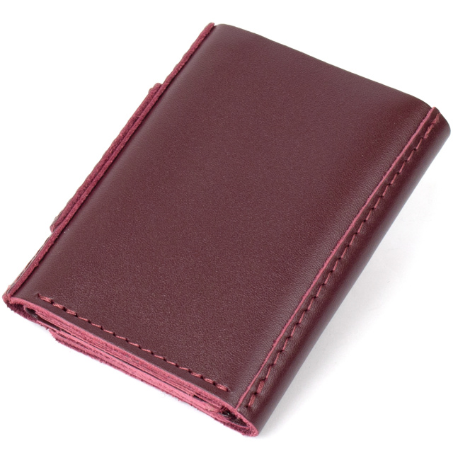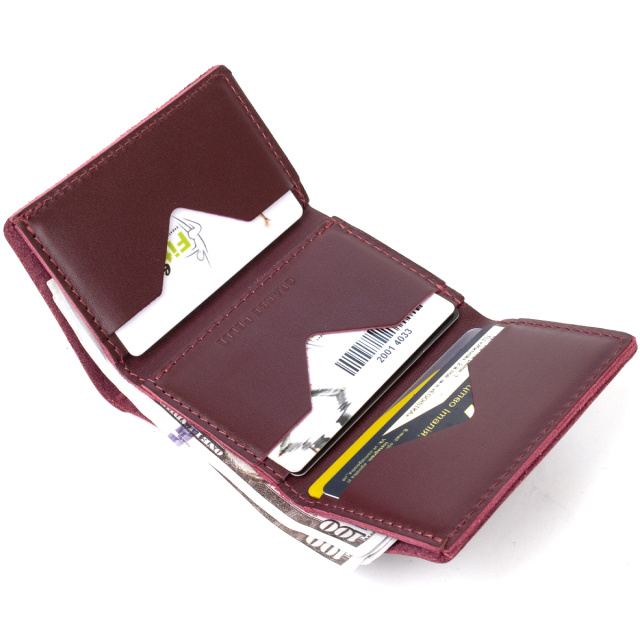 Превосходное кожаное портмоне высокого качества исполнения от украинского производителя. Имеет красивый богатый бордовый цвет и аккуратный швы такого же оттенка. Внутри присутствует практичное наполнение в виде функциональных слотов для карт и вместительного отделения для банкнот.