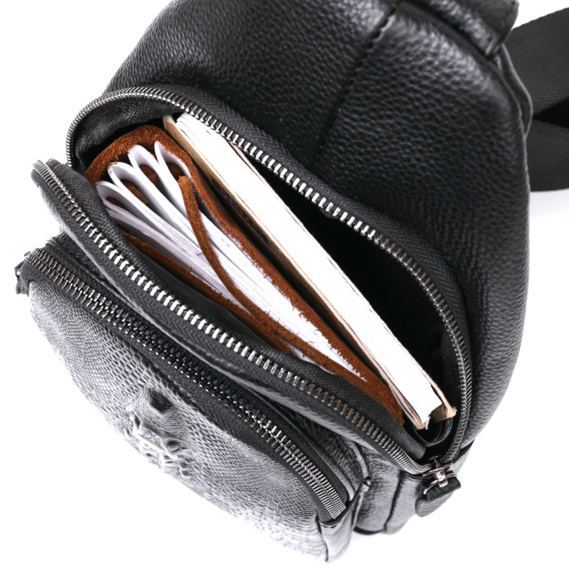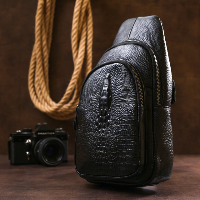 Современная молодежная сумка через плечо для активных и продвинутых людей. Выполнена модель из натуральной кожи высокого класса с повышенной износоустойчивостью. Имеет просторное основное отделение и дополнительные карманы на внешней стороне, что очень удобно и практично. Цвет изделия – черный, фактура – зернистая, внешний карман сделан под кожу крокодила.