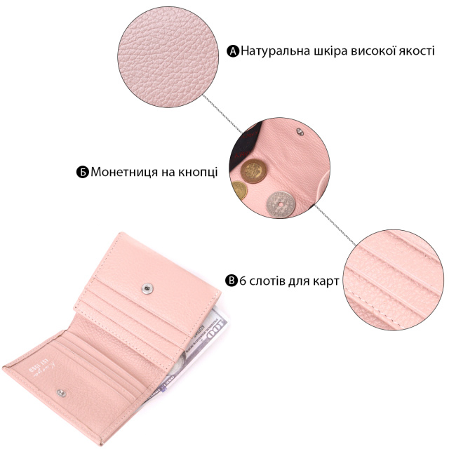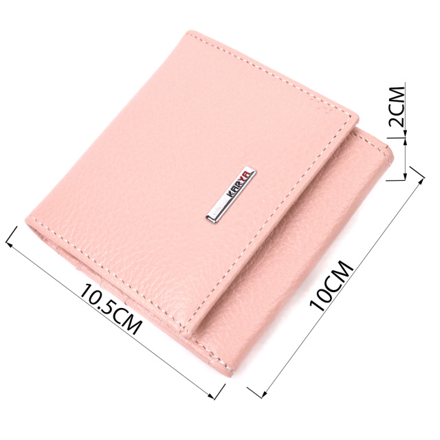 Красивый компактный женский кошелек из натуральной кожи высокого качества. Внутри есть отделение для купюр, шесть ячеек для кредитных карт, необычная монетница и скрытый один карман. В изделии использована качественная фурнитура, а также прочная фирменная подкладка. Небольшой кожаный кошелек поместится даже в самую маленькую сумочку. Закрывается модель в два сложения на кнопку. Такой кошелек, однозначно, порадует любую женщину.