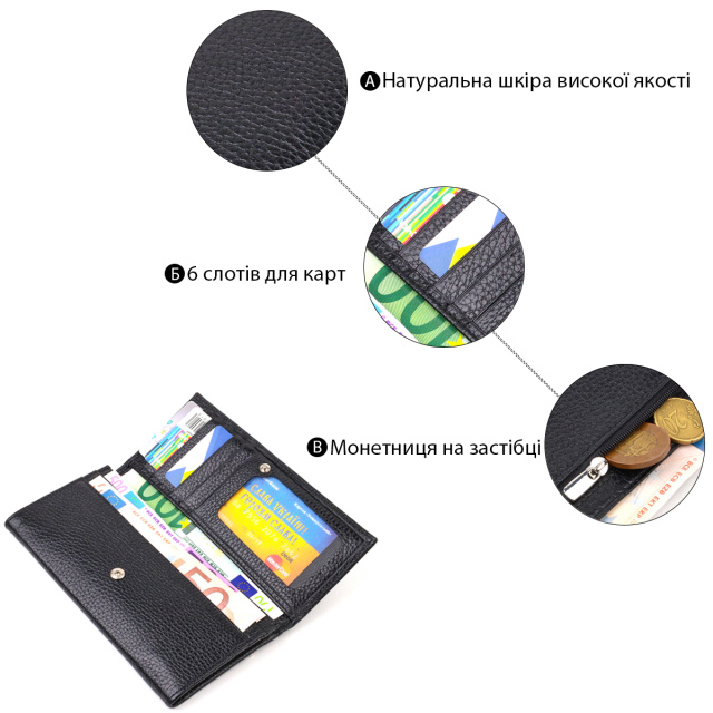 Особенности: горизонтальный формат, большой размер, двойное сложение, для карт, купюр и монет.