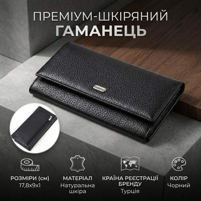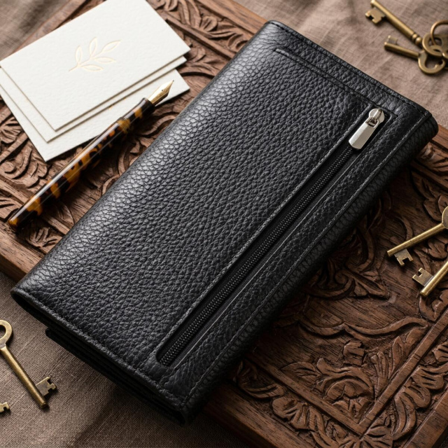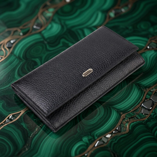 Изделие выполнено из натуральной кожи черного цвета. Материал приятно лежит в руке, выглядит стильно и хорошо подходит для ежедневного использования. Горизонтальный формат и большой размер делают модель удобной для тех, кто ценит порядок и хочет держать все необходимое в одном месте.