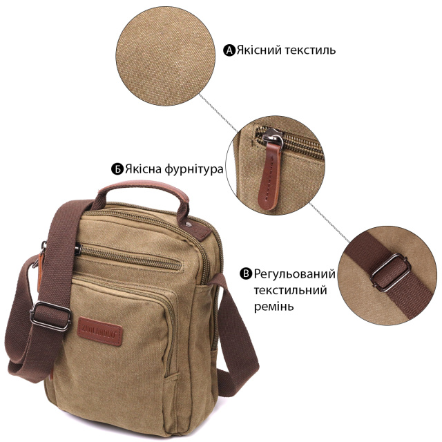 Добротная мужская сумка из качественного плотного текстиля. Аксессуар имеет два основных отделения, внутренние два кармана на молнии и открытого типа, и три внешних кармана на молниях разных размеров. Сумку можно носить в руке, на плече и через плечо. В сочетании с качественной фурнитурой и крепкой подкладкой сумка прослужит Вам не один год. Изделие станет прекрасным подарком для любого мужчины.