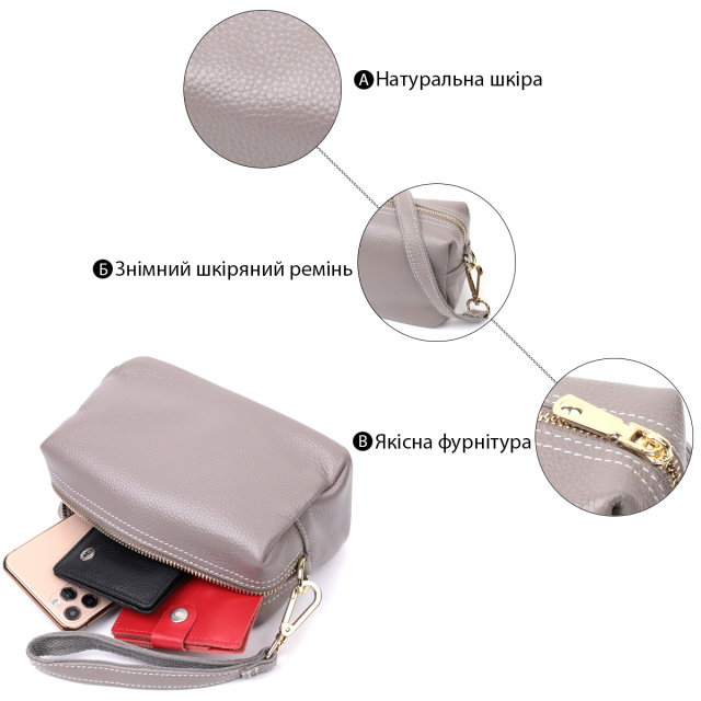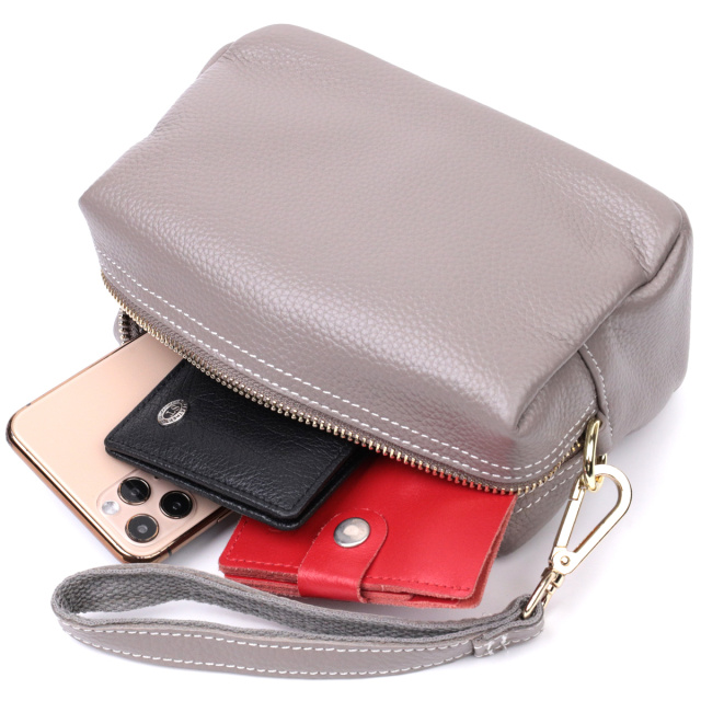 Маленькая сумка-клатч с двумя кожаными ремешками из качественной натуральной кожи, которая долго носится и не теряет свой первоначальный вид. Аксессуар состоит из одного основного отделения. Носить сумку можно в руке, на запястье, на плече и через плечо, для этого имеется кожаный съемный плечевой ремень, а также съемный кожаный кистевой ремень. В изделии использована качественная фурнитура цвета желтого золота. Универсальный вариант сумки как на вечер так и в качестве сумочки на каждый день.