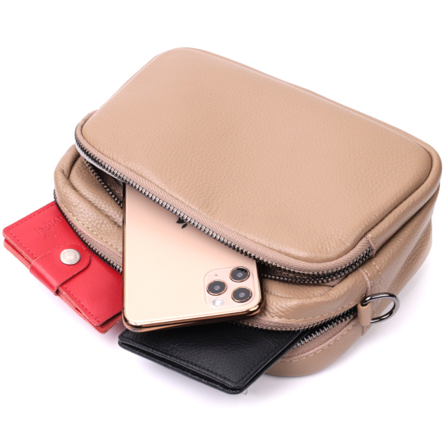 Интересная женская сумка с накладным карманом на лицевой стороне. Изделие пошито из качественной натуральной кожи, которая долго носится и не теряет свой первоначальный вид. Аксессуар состоит из одного основного отделения внутри которого расположен карман открытого типа и карман на молнии, также снаружи расположен карман на молнии, на тыльной стороне и накладной карман на молнии, на лицевой стороне. Носить сумку можно в руке как клатч, на плече и через плечо, для этого имеется текстильный съемный ремень. В изделии использована качественная фурнитура цвета темного серебра. Универсальный вариант сумки как на вечер так и в качестве сумочки на каждый день.