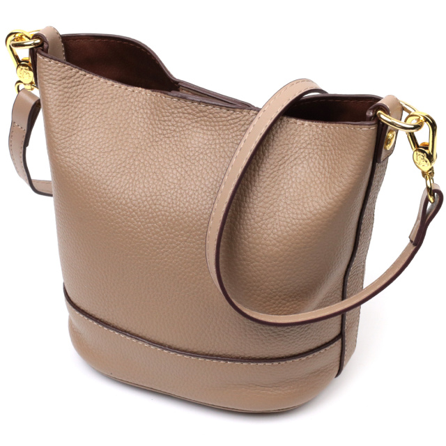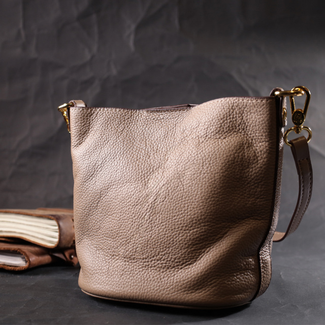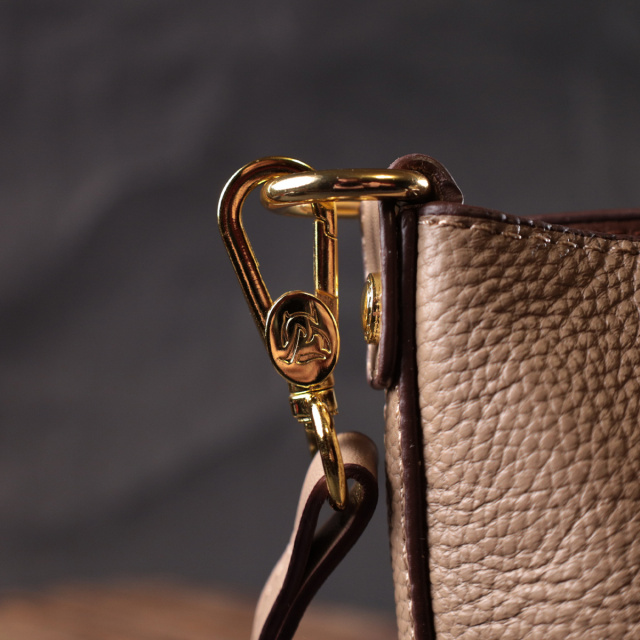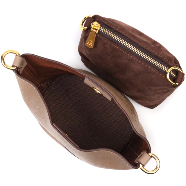 Интересная женская сумка с твердым дном, без подкладки и с косметичкой внутри. Изделие пошито из качественной натуральной кожи, которая долго носится и не теряет свой первоначальный вид. Аксессуар состоит из одного отделения в котором пристегивается косметичка, что закрывается на молнию. Носить сумку можно на плече и через плечо, для этого имеется кожаный съемный ремень. В изделии использована качественная фурнитура цвета желтого золота. Универсальный вариант сумки как на вечер так и в качестве сумочки на каждый день.