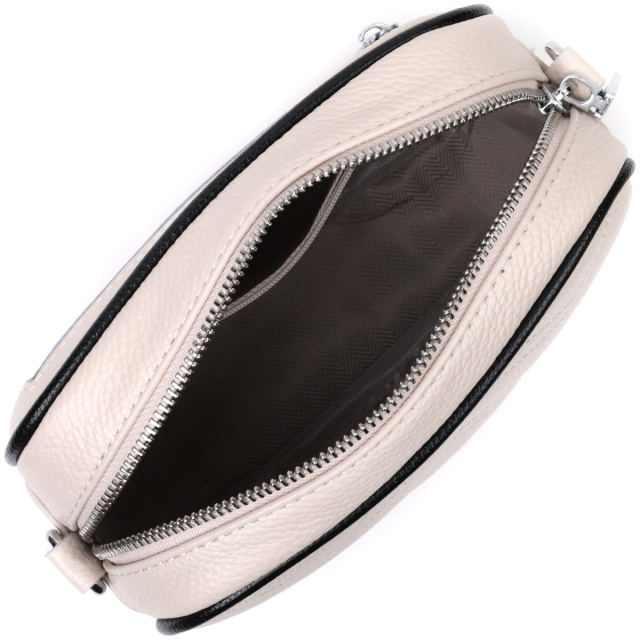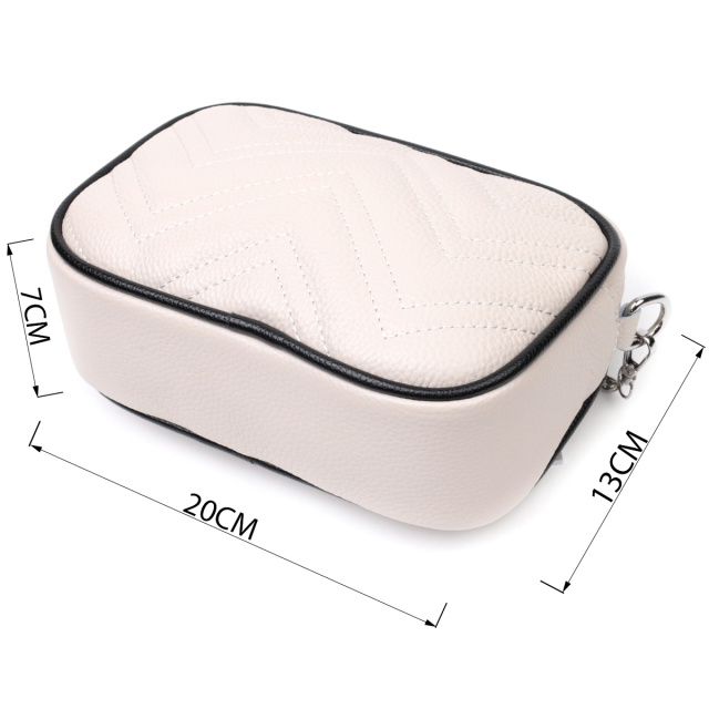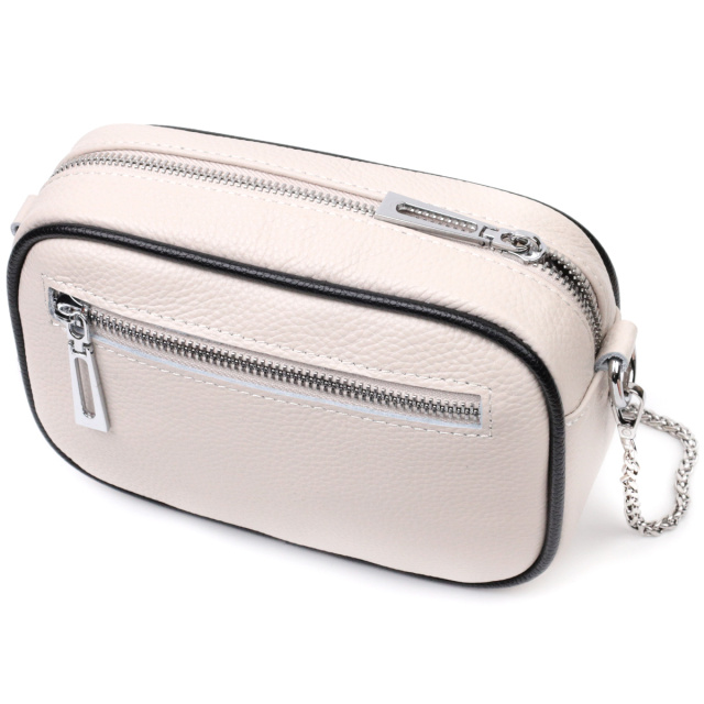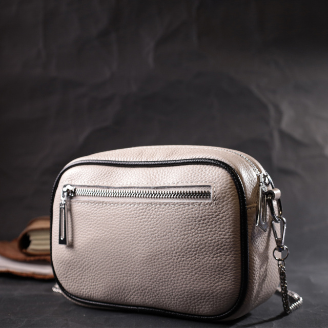 Красивая женская сумка из натуральной кожи флотар, на лицевой стороне прошита узором в виде треугольников. Аксессуар состоит из одного основного отделения, потайного кармана на молнии, кармана открытого типа и кармана на молнии снаружи. Носить сумку можно на плече и через плечо, для этого имеется съемная цепочка серебряного цвета. Кожаная сумка - лучший подарок для любой девушки.