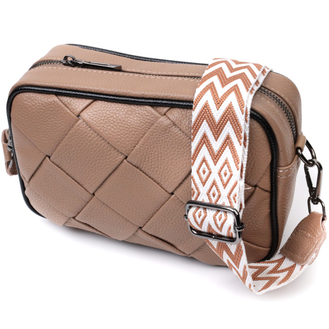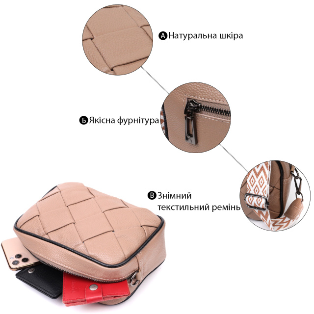 Стильная женская сумка с ромбовидными переплетами на лицевой стороне. Изделие пошито из качественной натуральной кожи, которая долго носится и не теряет свой первоначальный вид. Аксессуар состоит из одного основного отделения внутри которого расположен карман открытого типа и карман на молнии, также снаружи расположен карман на молнии, на тыльной стороне . Носить сумку можно в руке как клатч, на плече и через плечо, для этого имеется текстильный съемный ремень. В изделии использована качественная фурнитура цвета темного серебра. Универсальный вариант сумки как на вечер так и в качестве сумочки на каждый день.