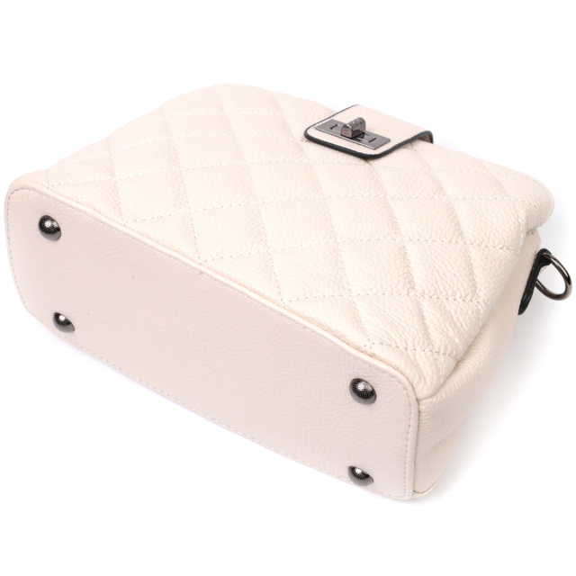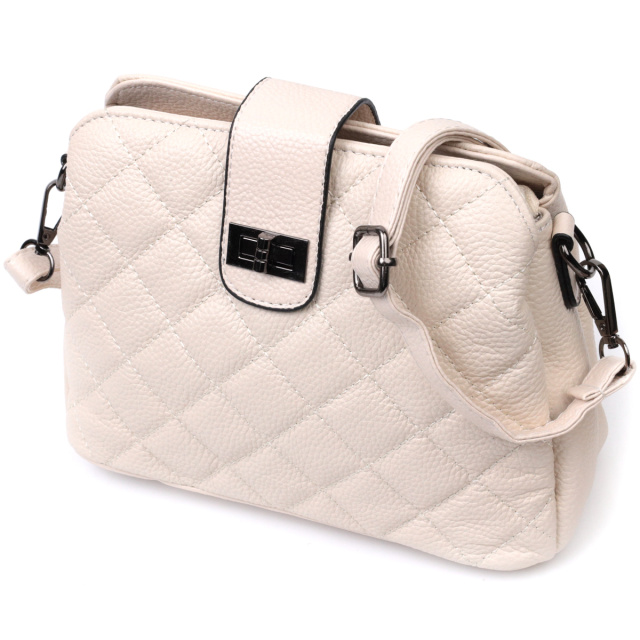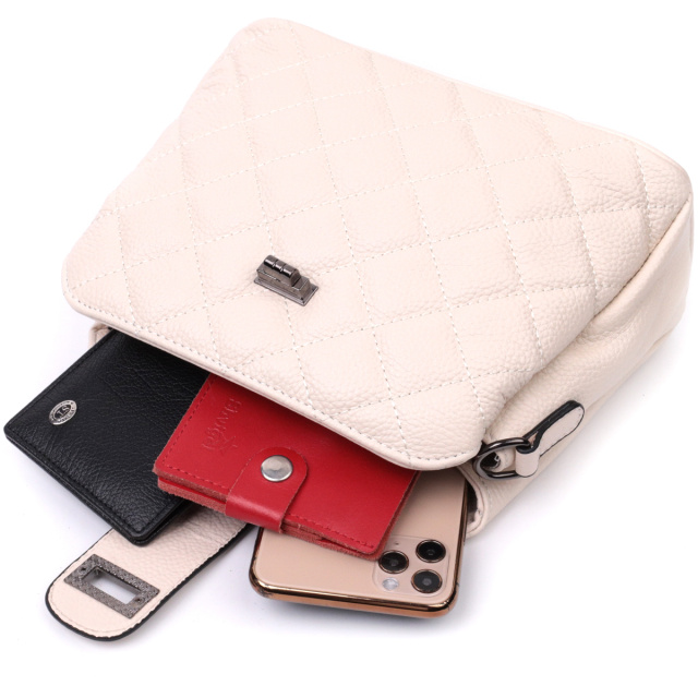 Стеганая женская сумка из натуральной кожи флотар, которая неприхотлива в уходе и долго носится. Аксессуар состоит из трех основных отделений, потайного кармана на молнии, кармана открытого типа и кармана на молнии снаружи. Носить сумку можно под рукой, на плече и через плечо, для этого имеется кожаный съемный ремень. В изделии использована качественная фурнитура цвета темного серебра. Универсальный вариант сумки как на вечер так и в качестве сумочки на каждый день.
