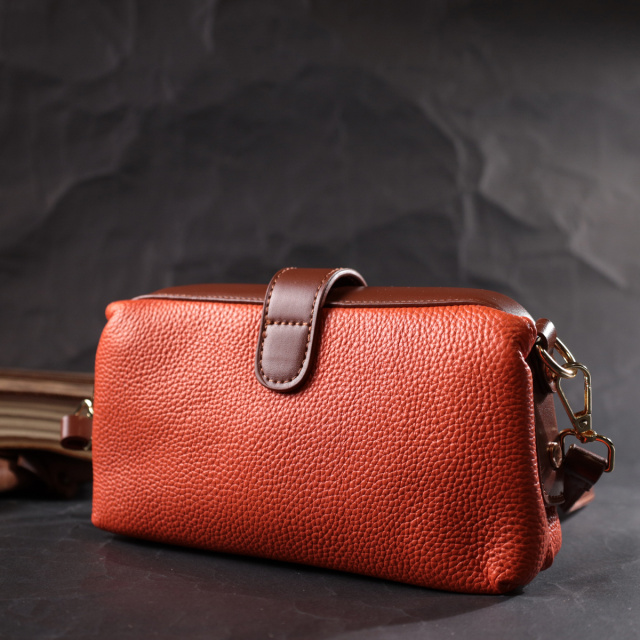 Привлекательная женская сумка-клатч с необычной защелкой, которая однозначно привлечет взгляды окружающих. Изделие пошито из качественной натуральной кожи, которая долго носится и не теряет свой первоначальный вид. Аксессуар состоит из одного основного отделения внутри которого расположен карман открытого типа и карман на молнии. Носить сумку можно в руке как клатч, на плече и через плечо, для этого имеется кожаный съемный ремень. В изделии использована качественная фурнитура цвета желтого золота.