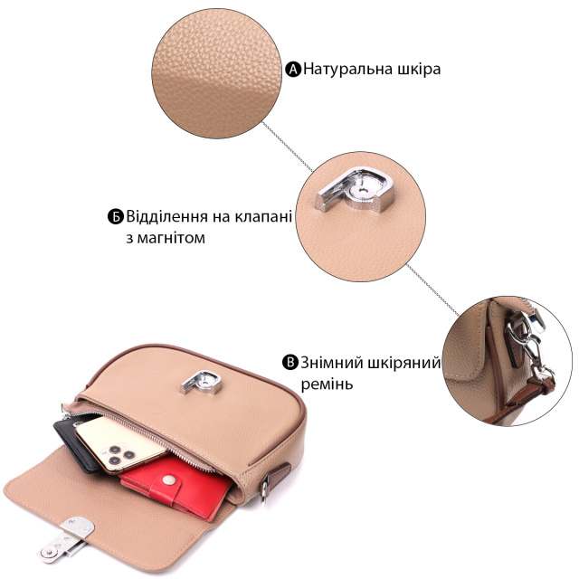 Интересная женская сумка из качественной натуральной кожи, которая долго носится и не теряет свой первоначальный вид. Аксессуар состоит из одного основного отделения внутри которого потайной карман на молнии, карман открытого типа и карман-перегородка, а снаружи, на тыльной стороне расположен карман на молнии. Носить сумку можно в руке, на плече и через плечо, для этого имеется кожаный съемный ремень. В изделии использована качественная фурнитура серебряного цвета. Универсальный вариант сумки как на вечер так и в качестве сумочки на каждый день.