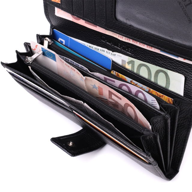 Кошелек закрывается пополам кожаным хлястиком на кнопку. Внутри предусмотрены четыре широких отделения для купюр, четырнадцать ячеек для пластиковых карт, два прилегающих кармана и два кармана на молнии. Снаружи расположена монетница на молнии, что делает использование аксессуара еще более удобным в повседневной жизни.