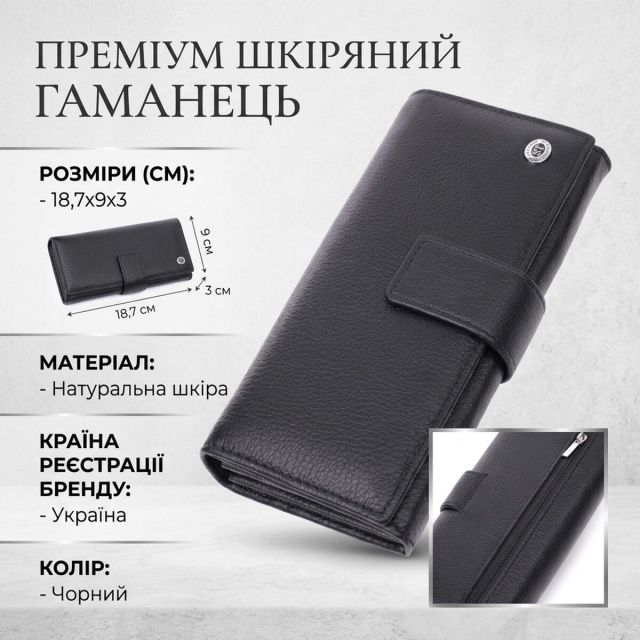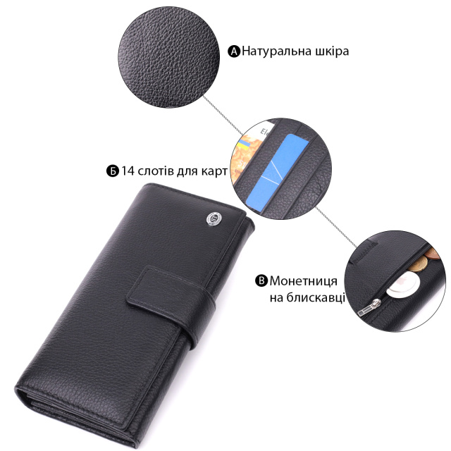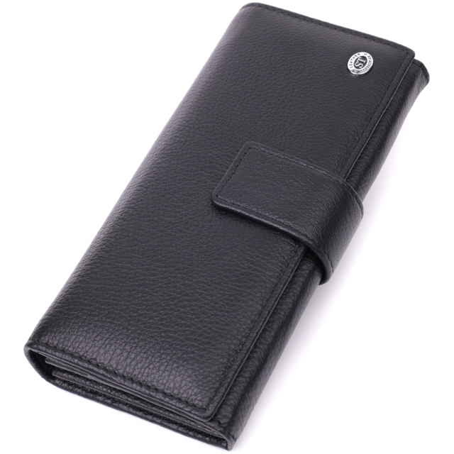 Изделие выполнено из натуральной кожи черного цвета. Материал хорошо проявляет себя в долгосрочной эксплуатации, выглядит стильно и подходит для ежедневного использования. Большой формат делает модель удобной для тех, кто любит порядок и хочет держать все необходимое в одном месте.