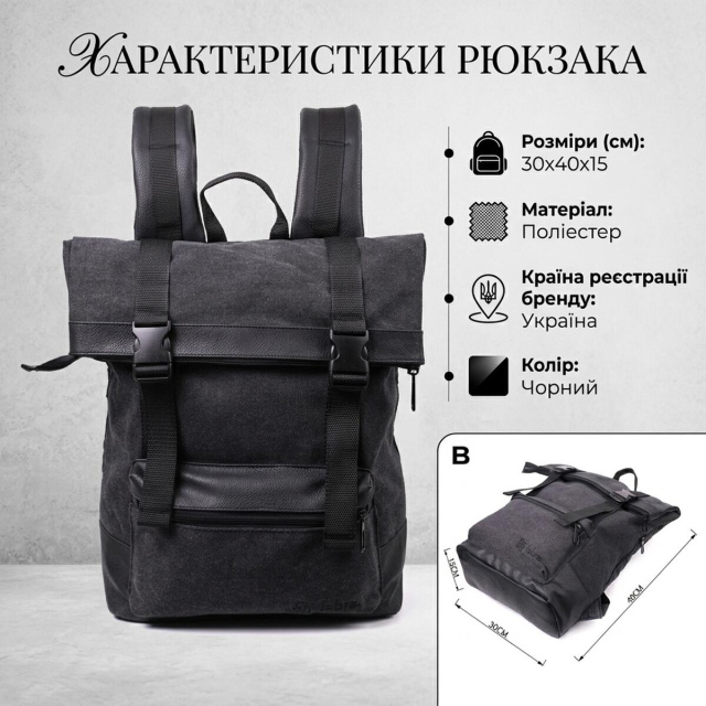 Модель выполнена в черном цвете и имеет конструкцию Rolltop, которая позволяет увеличивать вместительность изделия. Высота рюкзака в сложенном виде составляет 40 см, а в разложенном — 53 см, что делает его удобным как для повседневного использования, так и для ситуаций, когда нужно взять с собой больше вещей. Формат рюкзака хорошо подходит для офиса, учебы, поездок по городу и коротких поездок.