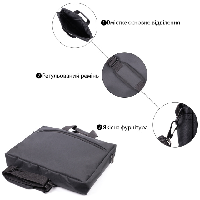 Сумка имеет одно основное отделение на молнии и вмещает ноутбук с диагональю до 15,6 дюйма. На лицевой стороне расположен горизонтальный карман на молнии для вещей, которые должны быть под рукой. Внутри предусмотрена прочная тканевая подкладка черного цвета, а надежная фурнитура подчеркивает практичность модели.