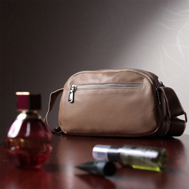 Женская сумка  из натуральной кожи флотар, которая имеет зернистую фактуру. В изделии использована кожа бежевого цвета. Аксессуар состоит из двух отделений, которые закрываются на молнии, потайного кармана на молнии и кармана открытого типа, а также кармана снаружи на тыльной стороне. Изделие имеет твердое дно, что позволяет держать форму. Носить сумку можно в руке, под рукой, на плече и через плечо, для этого имеется текстильный не съемный ремень. В аксессуаре использована качественная фурнитура цвета серебра. Отличный вариант для подарка близким и дорогим девушкам и женщинам.