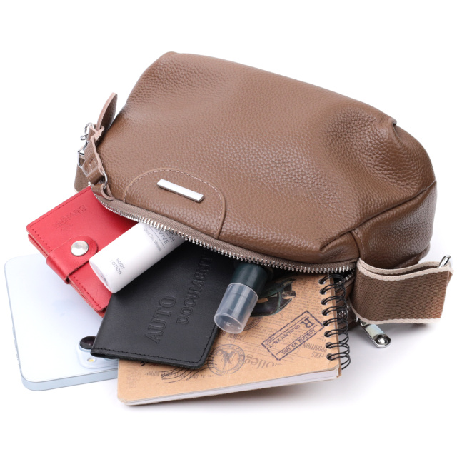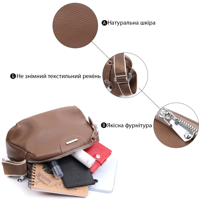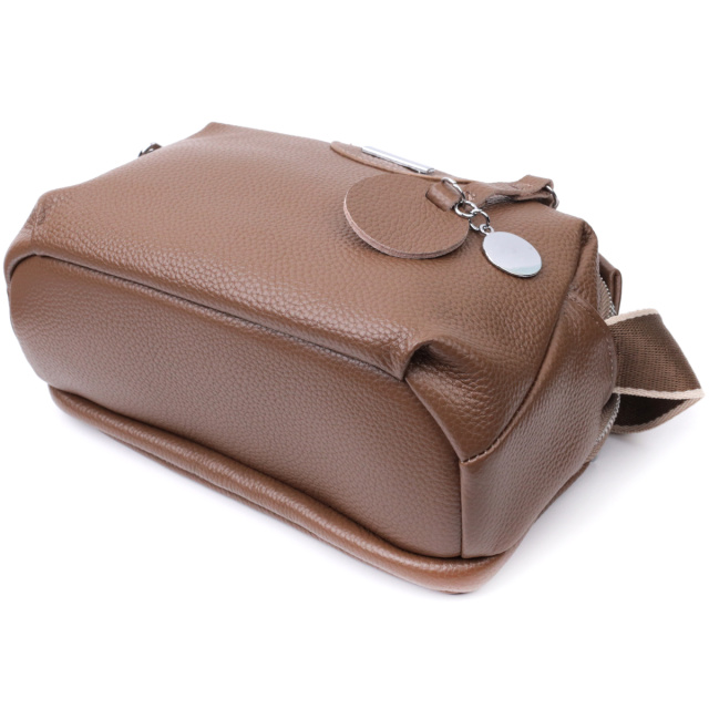 Практичная женская сумка из натуральной кожи флотар, которая имеет зернистую фактуру. В изделии использована кожа коричневого цвета. Аксессуар состоит из двух отделений, которые закрываются на молнии, потайного кармана на молнии и кармана открытого типа, а также кармана снаружи на тыльной стороне. Изделие имеет твердое дно, что позволяет держать форму. Носить сумку можно в руке, под рукой, на плече и через плечо, для этого имеется текстильный не съемный ремень. В аксессуаре использована качественная фурнитура цвета серебра. Отличный вариант для подарка близким и дорогим девушкам и женщинам.