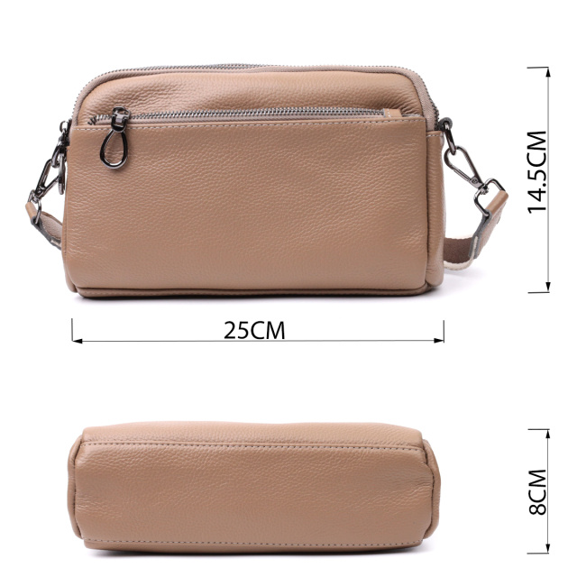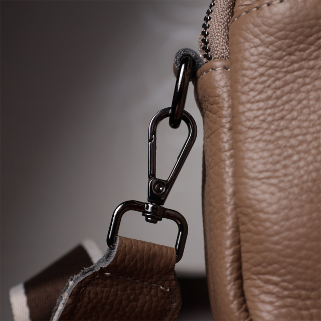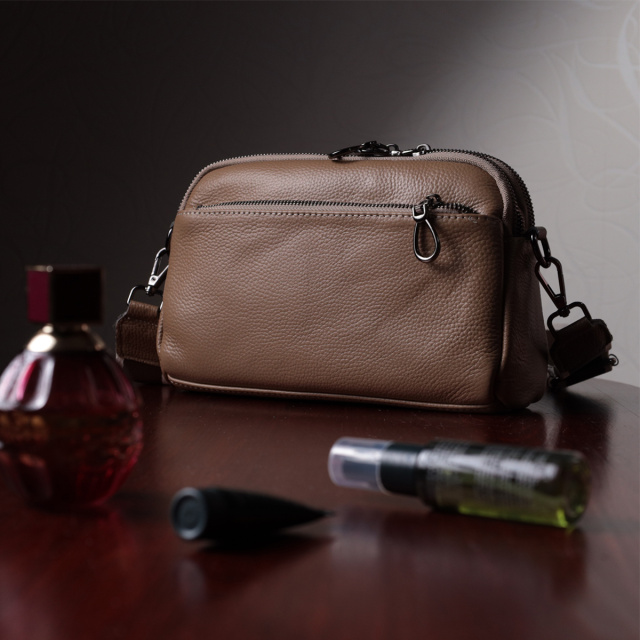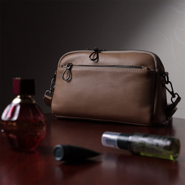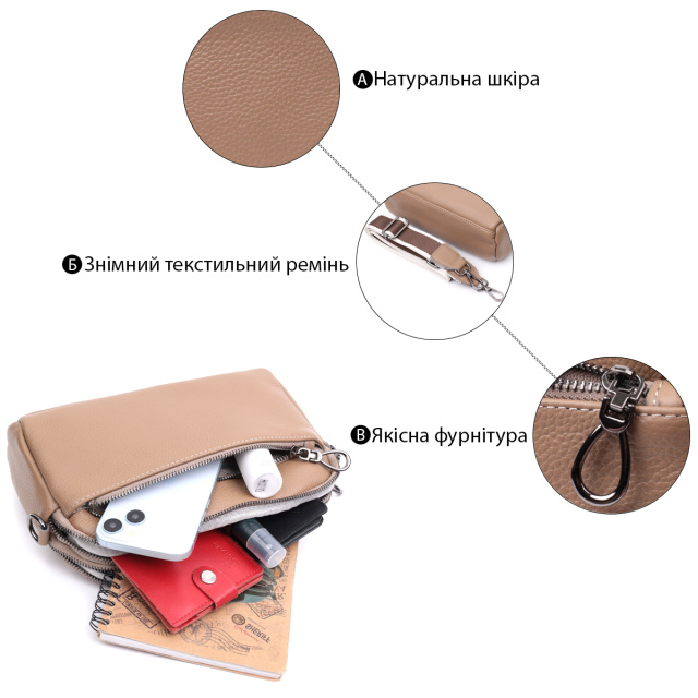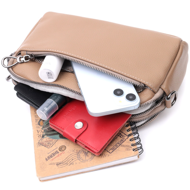 Стильная женская сумка на все случаи из натуральной кожи флотар, которая имеет зернистую фактуру. В изделии использована кожа бежевого цвета. Аксессуар состоит из двух отделений, которые закрываются на молнии, потайного кармана на молнии и кармана открытого типа, а также двух карманов снаружи на лицевой и тыльной стороне. Носить сумку можно в руке, под рукой, на плече и через плечо, для этого имеется текстильный съемный ремень. В аксессуаре использована качественная фурнитура цвета темного серебра. Отличный вариант для подарка близким и дорогим девушкам и женщинам.