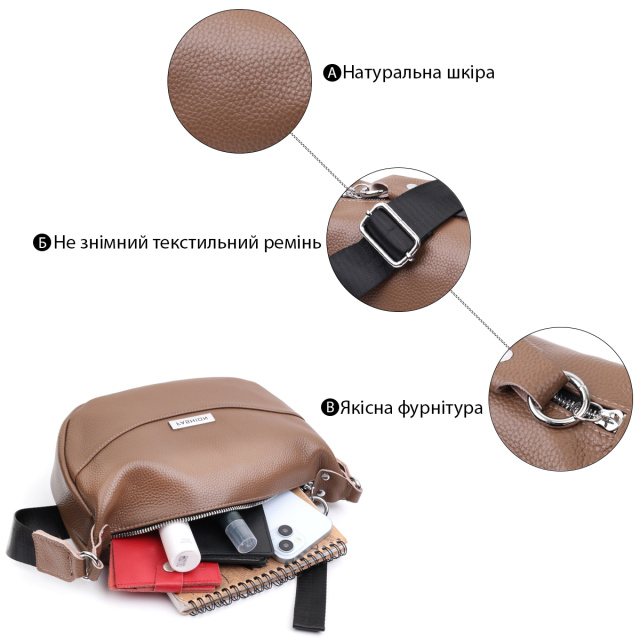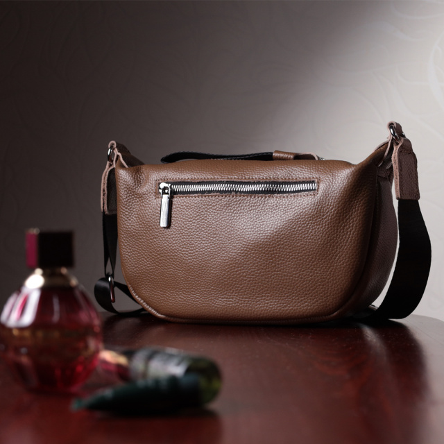 Модная женская сумка на плечо из натуральной кожи, которая очень хорошо носится и не теряет свой первоначальный вид со временем. Аксессуар состоит из основного отделения, потайного кармана на молнии и кармана открытого типа, а также кармана на молнии снаружи. Носить сумку удобно через плечо. В аксессуаре использована качественная фурнитура цвета серебра. Отличный вариант сумки на каждый день.