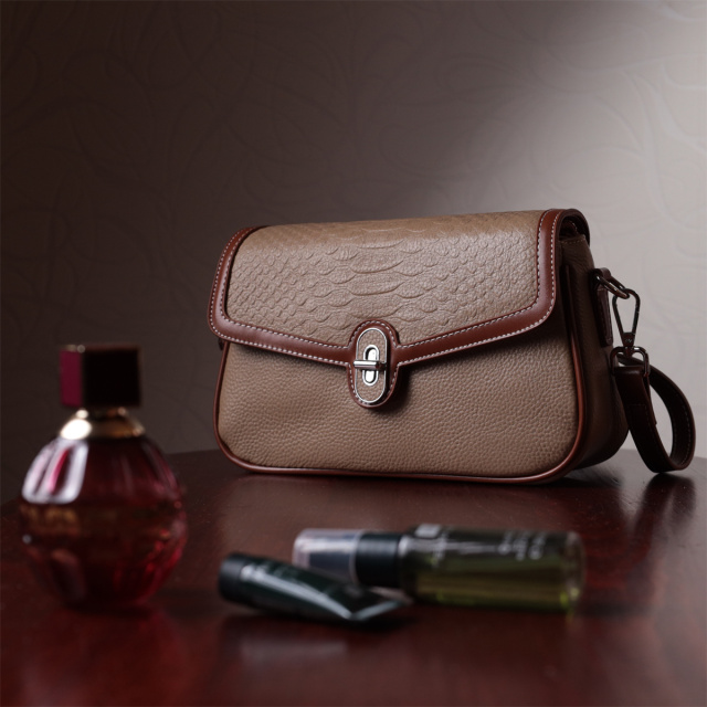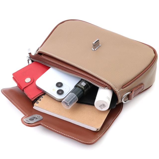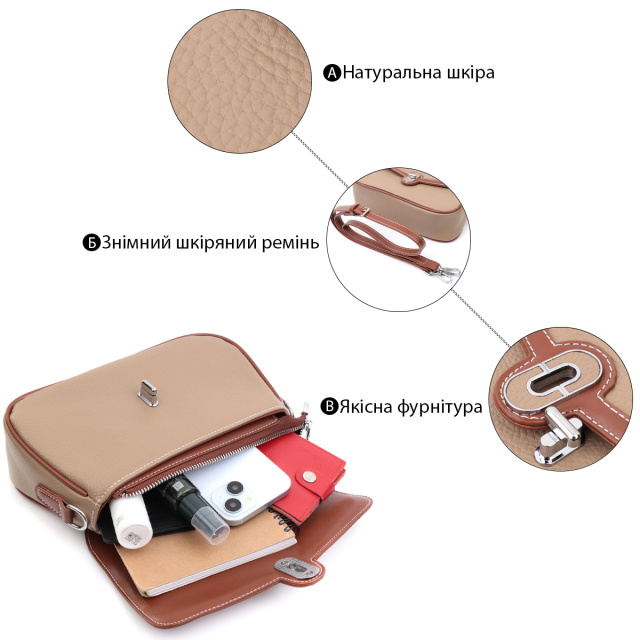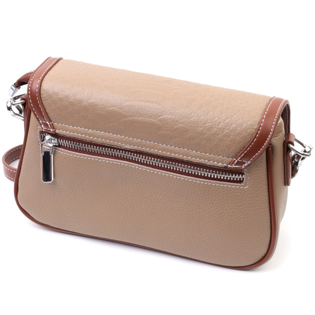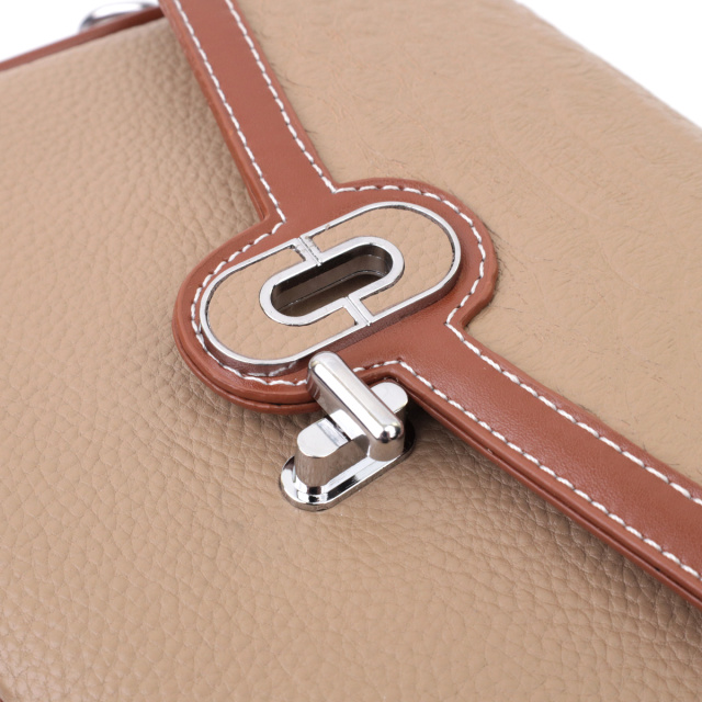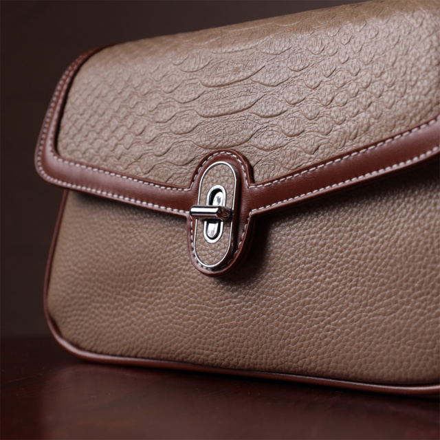 Стильная каркасная женская сумка из натуральной кожи. В изделии использована кожа бежевого и коричневого цвета. Притягивает взгляд в изделии фактурный клапан с тиснением под змею и изящная механическая защелка. Аксессуар состоит из основного отделения, кармана-перегородки на молнии, потайного кармана на молнии и кармана открытого типа, а также еще одного кармана снаружи, на тыльной стороне. Носить сумку можно в руке, под рукой, на плече и через плечо, для этого имеется кожаный съемный ремень. В аксессуаре использована качественная фурнитура цвета серебра. Универсальный вариант сумки на вечер, на каждий день, а также отлично будет сочетаться с деловым стилем.