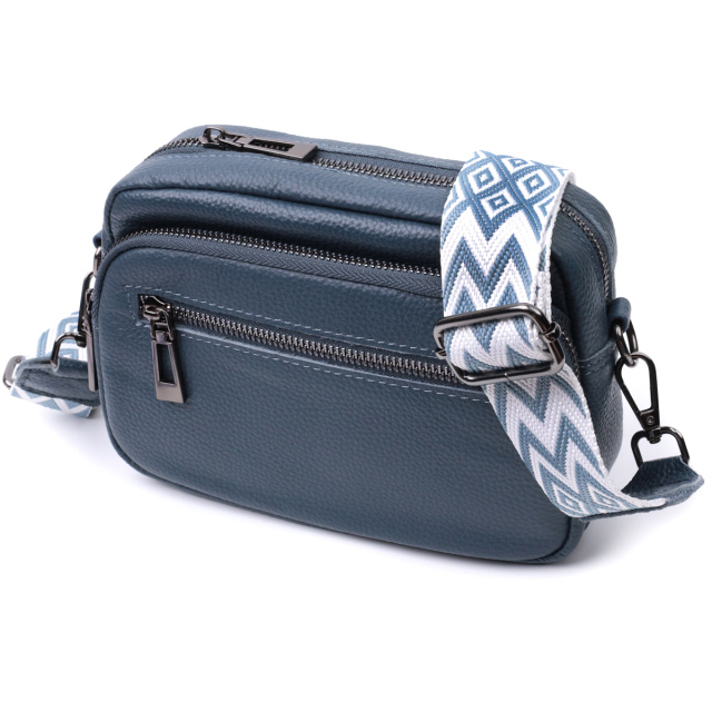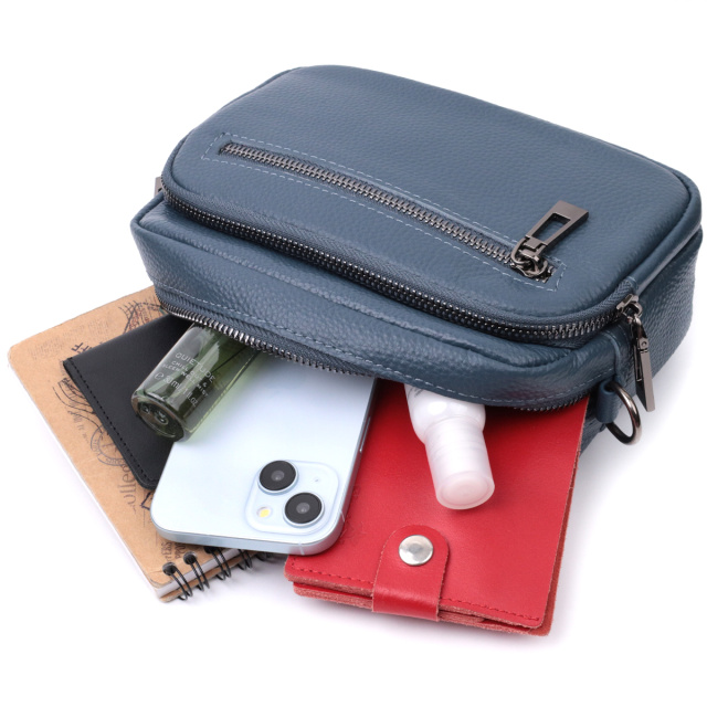 Небольшая но вместительная сумка для женщин из натуральной кожи. Аксессуар состоит из основного отделения, что закрывается на молнию, кармана открытого типа и кармана на молнии внутри и трех карманов снаружи. Носить сумку можно на плече и через плечо, также можно носить как клатч под рукой, для этого можно снять текстильный ремешок.