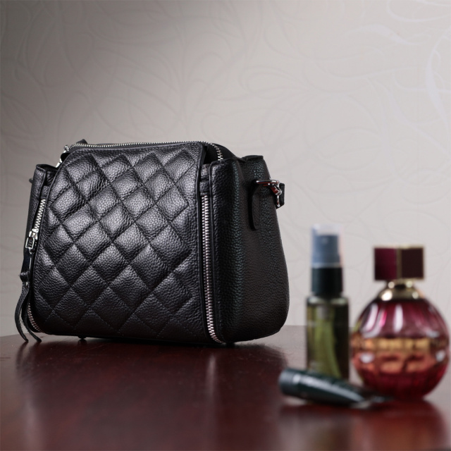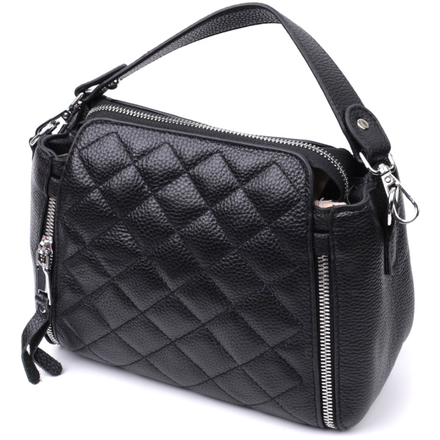 Удобная женская сумка из натуральной кожи флотар, которая неприхотлива в уходе и долго носится. Изделие декорировано металлическими молниями по бокам, а также прошито ромбами на лицевой и тыльной стороне. В изделии использованы металлические ножки на дне сумки для защиты дна от потертостей и механических повреждений. Аксессуар состоит из основного отделения, кармана-перегородки и потайного кармана на молнии внутри. Носить сумку можно в руке, на плече и через плечо, для этого имеются кожаные съемные ремень и ручка. В аксессуаре использована качественная фурнитура цвета серебра. Универсальный вариант сумки на вечер, на каждий день, а также отлично будет сочетаться с деловым стилем.