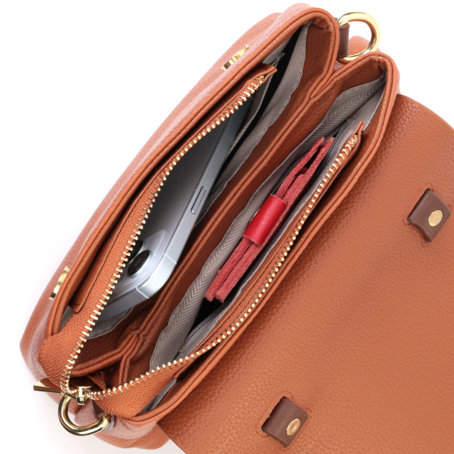 Деловая сумка для женщин в сочетании двух цветов рыжего и коричневого из натуральной кожи флотар, которая неприхотлива в уходе и долго носится. В изделии использованы металлические ножки на дне сумки для защиты дна от потертостей и механических повреждений. Аксессуар состоит из основного отделения, кармана открытого типа и потайного кармана на молнии внутри. Носить сумку можно в руке, на плече и через плечо, для этого имеются текстильный съемные ремень и кожаная ручка. В аксессуаре использована качественная фурнитура цвета желтого золота. Универсальный вариант сумки под деловой стиль и на каждий день.
