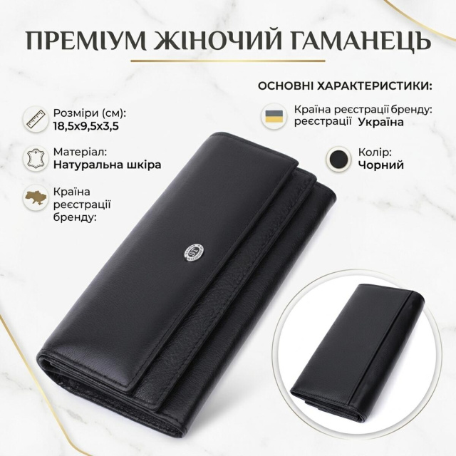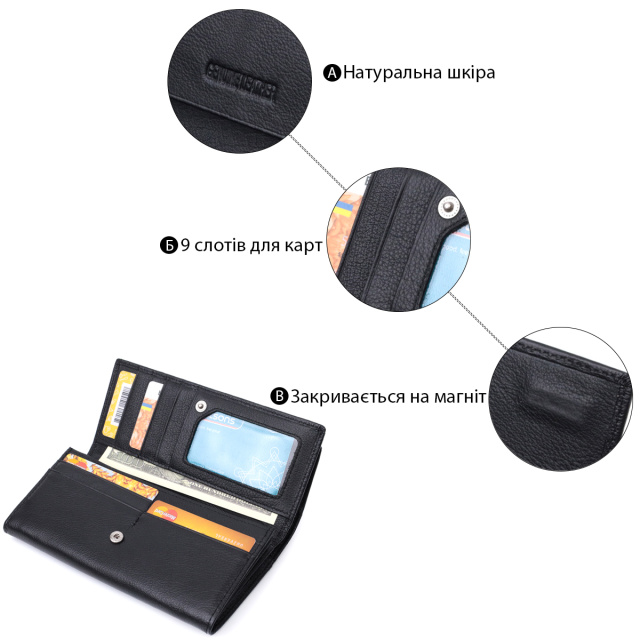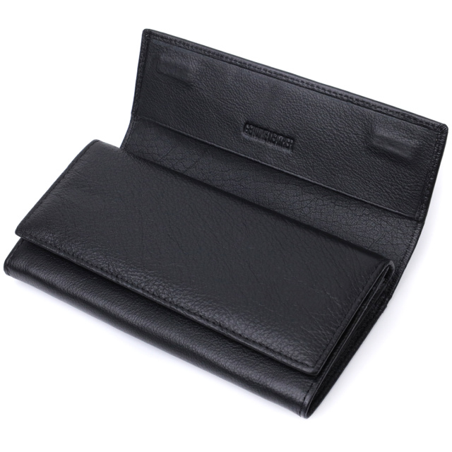 Особенности: большой формат, двойное сложение, два клапана, для карт, купюр и монет.