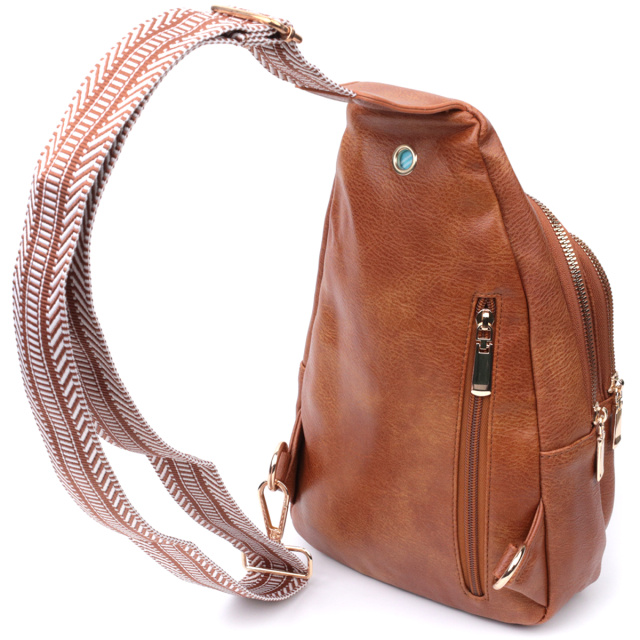 Оригинальная слинг сумка из качественной экокожи, в интересном рыжем цвете. Экокожа - высококачественная альтернатива натуральному материалу, которая очень устойчива к трению, к низким температурам, отлично носится в отличии от других искусственных материалов, а также имеет гипоаллергенный состав в отличии от натуральной кожи. Данная модель состоит из одного основного отделения которое закрывается на молнию и в котором находится потайной карман, а также трех карманов снаружи и одного отверстия для кабеля или наушников, что очень удобно в современной мире. Основной фишкой модели является удобный регулируемый плечевой ремешок из стильным узором. Отличный вариант сумки на каждый день и в любой сезон.