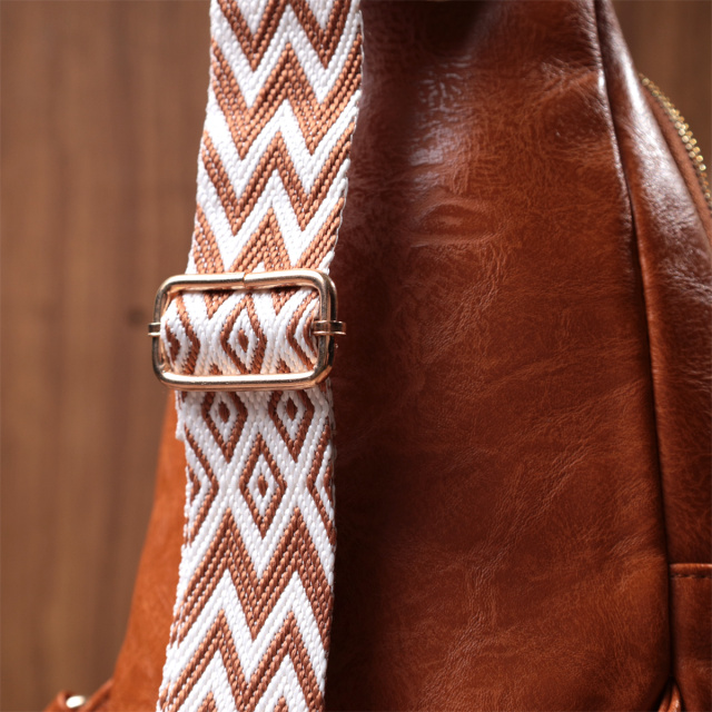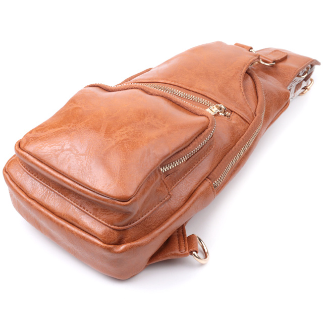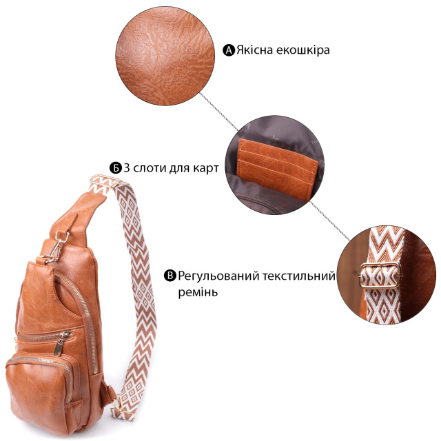 Экокожа - высококачественная альтернатива натуральному материалу, которая очень устойчива к трению, к низким температурам, отлично носится в отличии от других искусственных материалов, а также имеет гипоаллергенный состав в отличии от натуральной кожи.Предлагаем Вашему вниманию удобную слинг сумку из экокожи в интересном рыжем цвете. Данная модель состоит из одного основного отделения которое закрывается на молнию и в котором находится карман на молнии и три кармана для кредитных карт, а также трех карманов снаружи и одного отверстия для кабеля или наушников, что очень удобно в современной мире. Основной фишкой модели является удобный регулируемый плечевой ремешок в этническом стиле, что очень модно уже несколько сезонов.