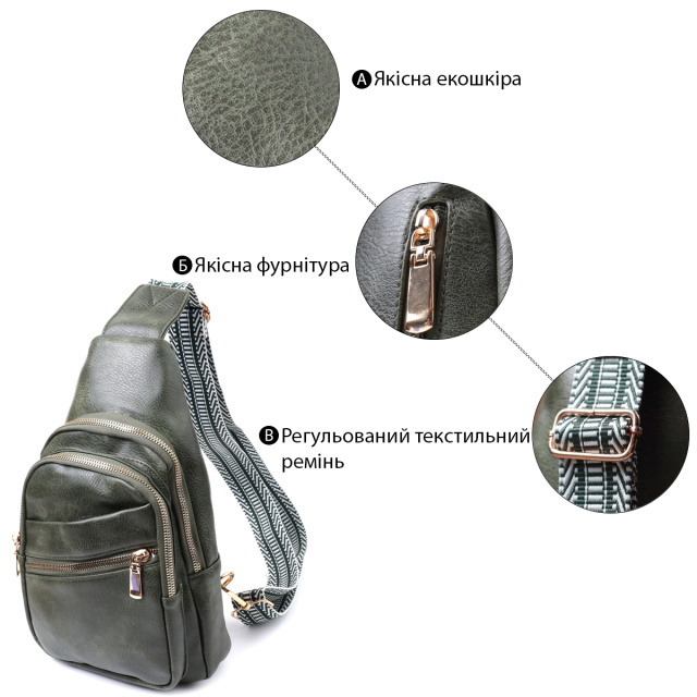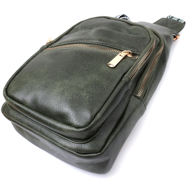 Предлагаем Вашему вниманию удобную слинг сумку из экокожи в стильном зеленом цвете. Данная модель состоит из одного основного отделения которое закрывается на молнию и в котором находится карман на молнии и карман открытого типа внутри, а также четырех карманов снаружи и одного отверстия для кабеля или наушников, что очень удобно в современной мире. Основной фишкой модели является удобный регулируемый плечевой ремешок в этническом стиле, что очень модно уже несколько сезонов. Экокожа - высококачественная альтернатива натуральному материалу, которая очень устойчива к трению, к низким температурам, отлично носится в отличии от других искусственных материалов, а также имеет гипоаллергенный состав в отличии от натуральной кожи.