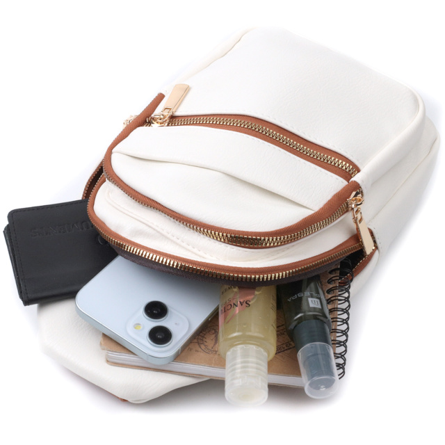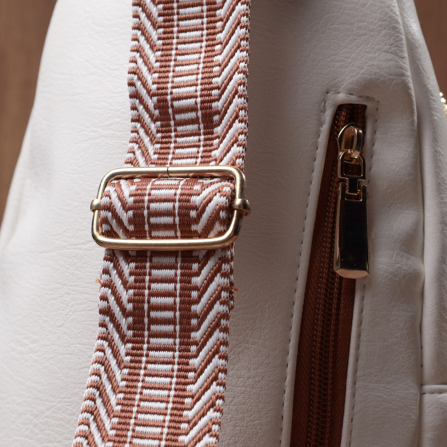 Предлагаем Вашему вниманию удобную слинг сумку из экокожи в сочетании белого и коричневого цвета. Данная модель состоит из одного основного отделения которое закрывается на молнию и в котором находится карман на молнии и карман открытого типа внутри, а также четырех карманов снаружи и одного отверстия для кабеля или наушников, что очень удобно в современной мире. Основной фишкой модели является удобный регулируемый плечевой ремешок в этническом стиле, что очень модно уже несколько сезонов. Экокожа - высококачественная альтернатива натуральному материалу, которая очень устойчива к трению, к низким температурам, отлично носится в отличии от других искусственных материалов, а также имеет гипоаллергенный состав в отличии от натуральной кожи.