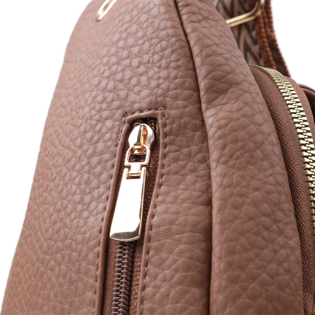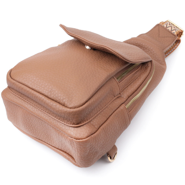 Практичная женская слинг сумка из зернистой экокожи в стильном коричневом цвете. Данная модель состоит из одного основного отделения которое закрывается на молнию и в котором находится карман на молнии и четыре кармана для кредитных карт внутри, а также двух карманов снаружи и одного отверстия для кабеля или наушников, что очень удобно в современной мире. Акцентом данной модели является удобный регулируемый плечевой ремешок в этническом стиле, что очень модно уже несколько сезонов. Экокожа - высококачественная альтернатива натуральному материалу, которая очень устойчива к трению, к низким температурам, отлично носится в отличии от других искусственных материалов, а также имеет гипоаллергенный состав в отличии от натуральной кожи.