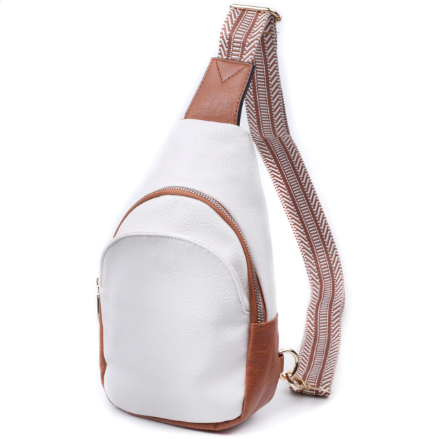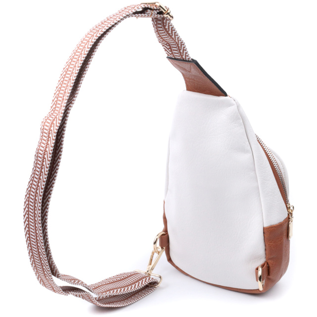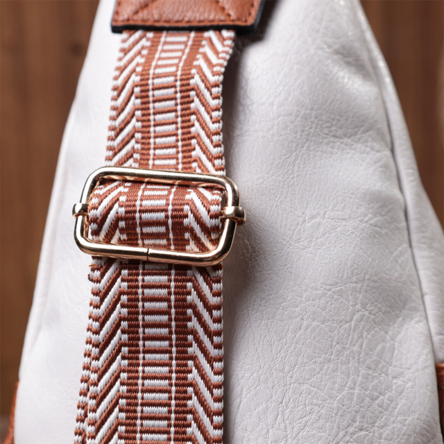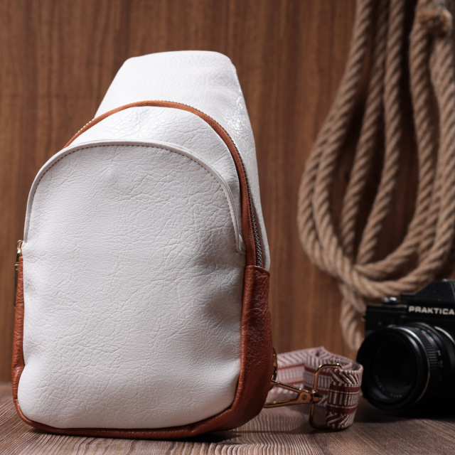 Женская сумка через плечо из качественной экокожи в красивом белом цвете с коричневыми вставками. Данная модель состоит из одного основного отделения которое закрывается на молнию и в котором находится потайной карман на молнии и три ячейки для кредитных карт внутри, а также одного кармана снаружи, на лицевой стороне. Акцентом данной модели является удобный регулируемый плечевой ремешок в этническом стиле, что очень модно уже несколько сезонов. Экокожа - высококачественная альтернатива натуральному материалу, которая очень устойчива к трению, к низким температурам, отлично носится в отличии от других искусственных материалов, а также имеет гипоаллергенный состав в отличии от натуральной кожи. Практичный вариант сумки, который порадует любую девушку, так как все вещи под рукой и в безопасности.