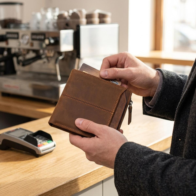 Практичный аксессуар для карт, купюр, монет и документов, который хорошо подходит для ежедневного использования.
