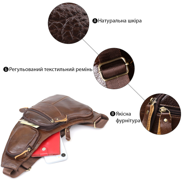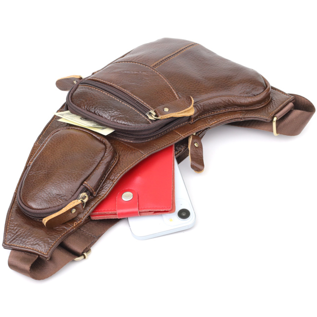 Эта кожаная сумка через плечо с большим количеством карманов — универсальный аксессуар для активной жизни, который сочетает в себе удобство, стиль и качество.